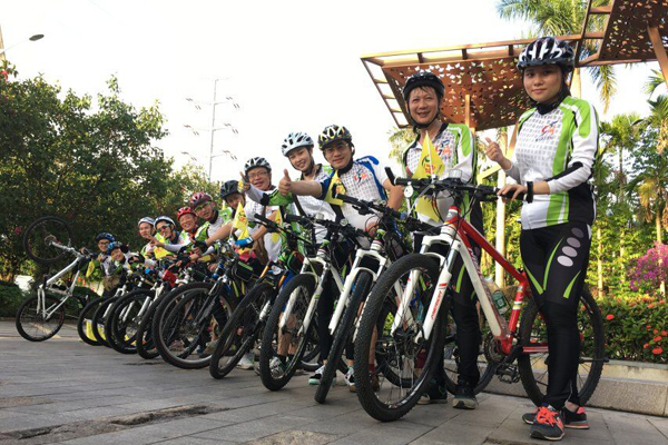 三五九旅骑行队”logo的统一服装,自行车上搭载着印有旅骑行队logo的彩旗,脚踩公路车或山地车,一路高喊“健康中国,幸福海南,快乐骑行”等口号,先后在陵水清水湾、三亚万科森林度假公园等地开展骑行活动。那种享受骑行的快乐写在每位队员的脸上,人人感觉自己仿佛就是海南旅游业的宣传大使。