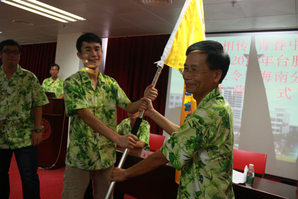 海南省台湾同胞联谊会副巡视员、夏令营营长符江致欢迎词,并宣布以“龙脉相传•青春中华”为主题的全国台联2016年台胞青年千人夏令营海南分营正式开营。随后,夏令营营长符江为夏令营学生代表授旗,标志着海南分营系列活动正式拉开帷幕。