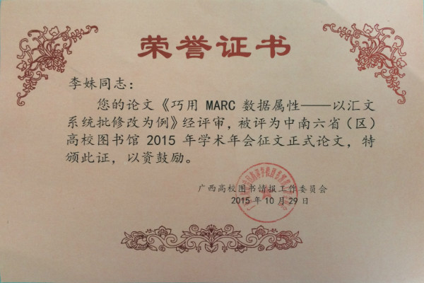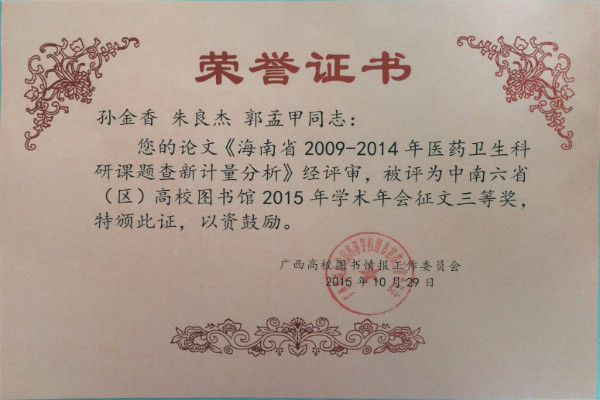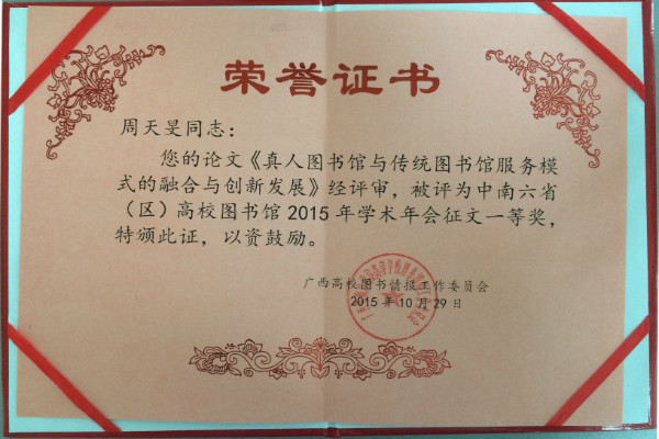 中南六省(区)高校图书馆2015年学术年会于近日结束,会上公布了2015年学术年会征文获奖情况并颁发了证书。我校图书馆周天旻老师凭借《真人图书馆与传统图书馆服务模式的融合与创新发展》一文获得本次征文的一等奖,孙金香、朱良杰、郭孟甲老师撰写的《海南省2009-2014年医药卫生科研课题查新计量分析》一文获得三等奖,李妹老师撰写的《巧用MARC数据属性——以汇文系统批修改为例》入选本次会议论文。值得一提的是周天旻老师的论文除在大会上交流外还被专家着重点评。