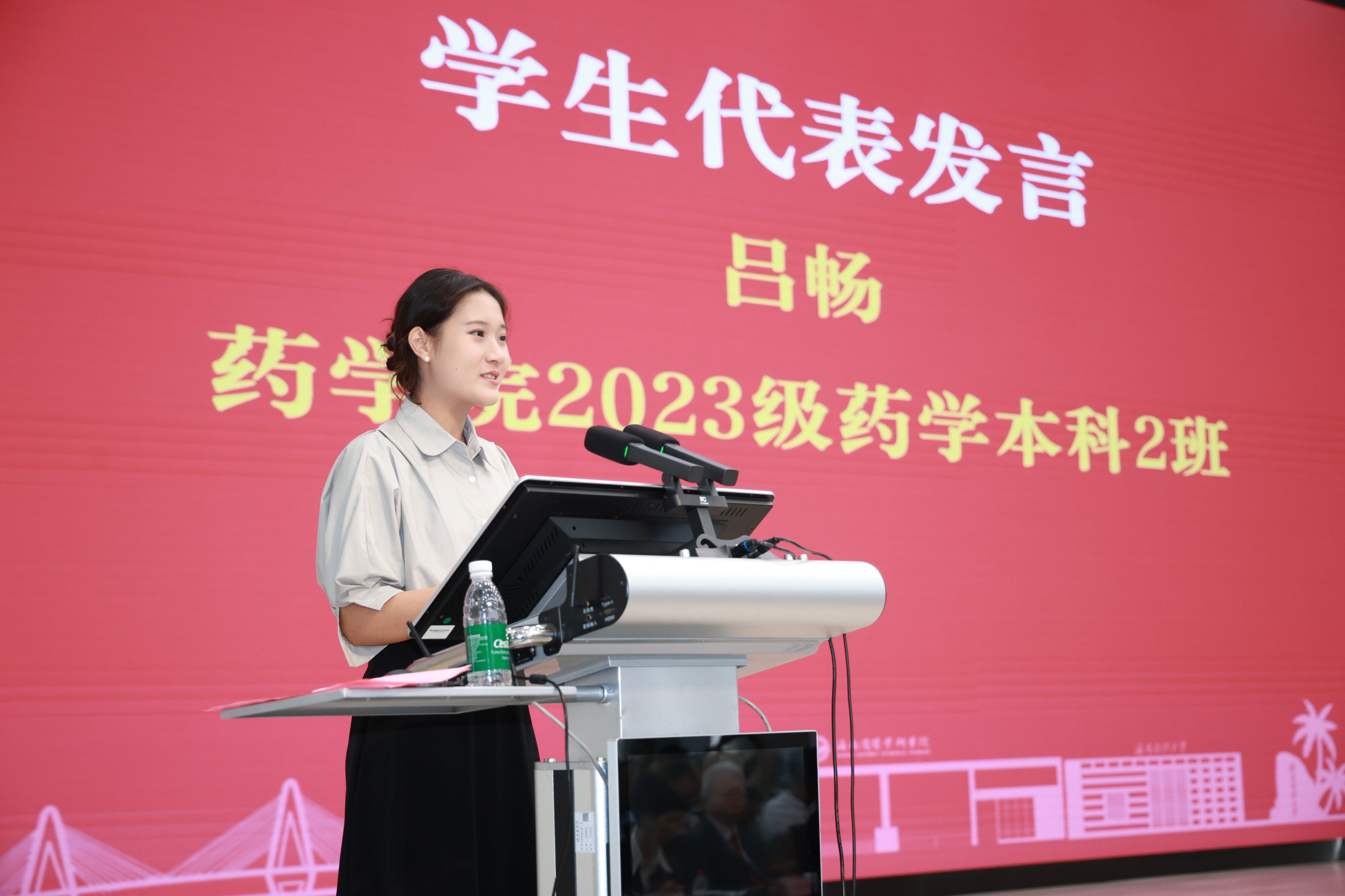 药学院2023级本科学生吕畅作为学生代表发言。她深情回顾了入学以来遇见的老师和辅导员在学习、科研和生活中给予的悉心教导与关怀,表达了对老师们的感恩之情,并表示将继续努力学习,为海医的发展添砖加瓦。