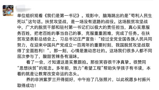 片尾,那些在脱贫攻坚战场上不幸牺牲的第一书记们光辉的名字、温暖的笑脸、朴素的话语展现在观众面前,不少党员干部默默流下了眼泪。