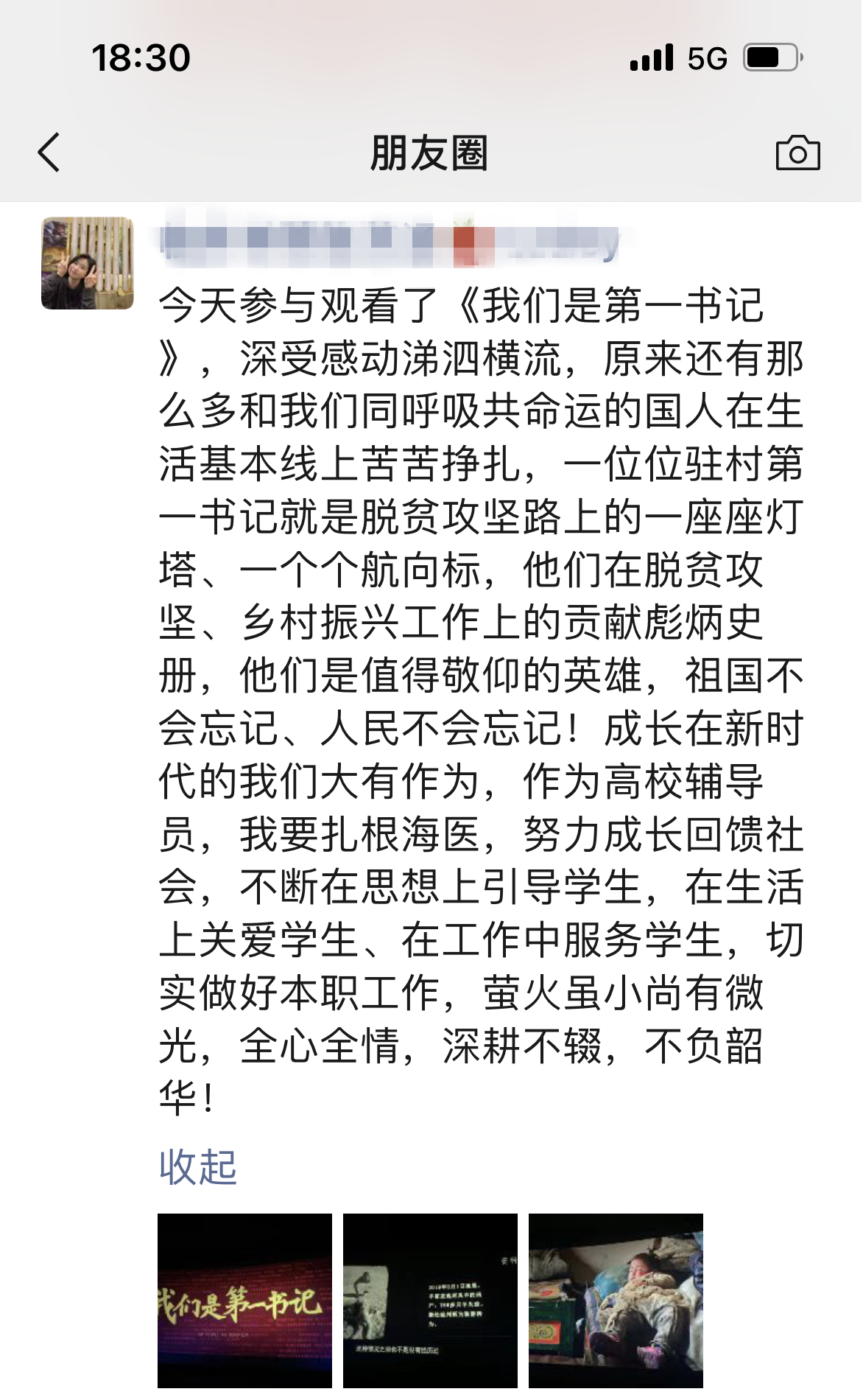 观影结束后,大家感慨到,唯有伟大的中国共产党才能在短短百年时间里争取民族独立和人民解放、实现国家富强和人民幸福,才能实现9899万多人全部脱贫、14亿中国人民共同迈进小康社会这一举世瞩目的伟大事业,才能让人民与人民,人民与土地,人民与党的关系如此紧密。大家表示,从影片中汲取了奋进新时代的动力,将从小事做起,从本职工作做起,全心全情,努力为学校高质量、高标准建设热带特色鲜明的国际化高水平医科大学和海南建设自由贸易港贡献力量。