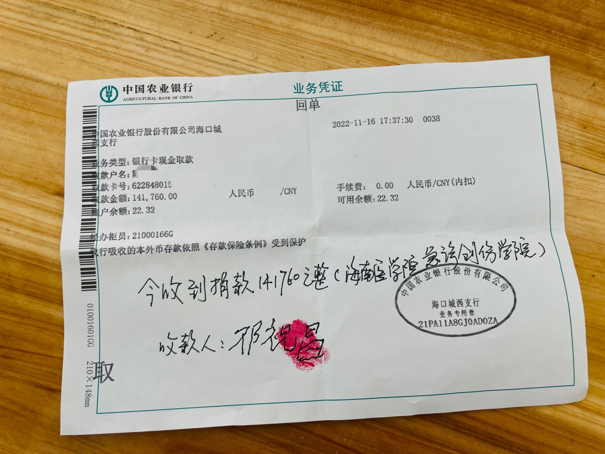 此前,学校教职工捐款于10月1日由急诊创伤学院、第一附属医院代表转交邓琦父母。在得知邓琦校友突然离世后,学校党委书记杨俊、校长赵建农第一时间将捐款转交学院,第一附属医院工会也捐出爱心款。两次捐款充分展现了 全体师生和校友的爱心, 急创学院校友分会感谢海医广大师生及校友伸出援助之手,给邓琦家人送去了爱与关怀。