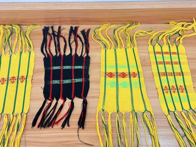 王兰老师从理论到实践,手把手悉心指导,两周的认真学习和反复实践后,第一期学习班的11名同学初步掌握了黎锦织造的基本步骤和手法,完成了老师布置的每人织造一小段黎锦的学习任务。