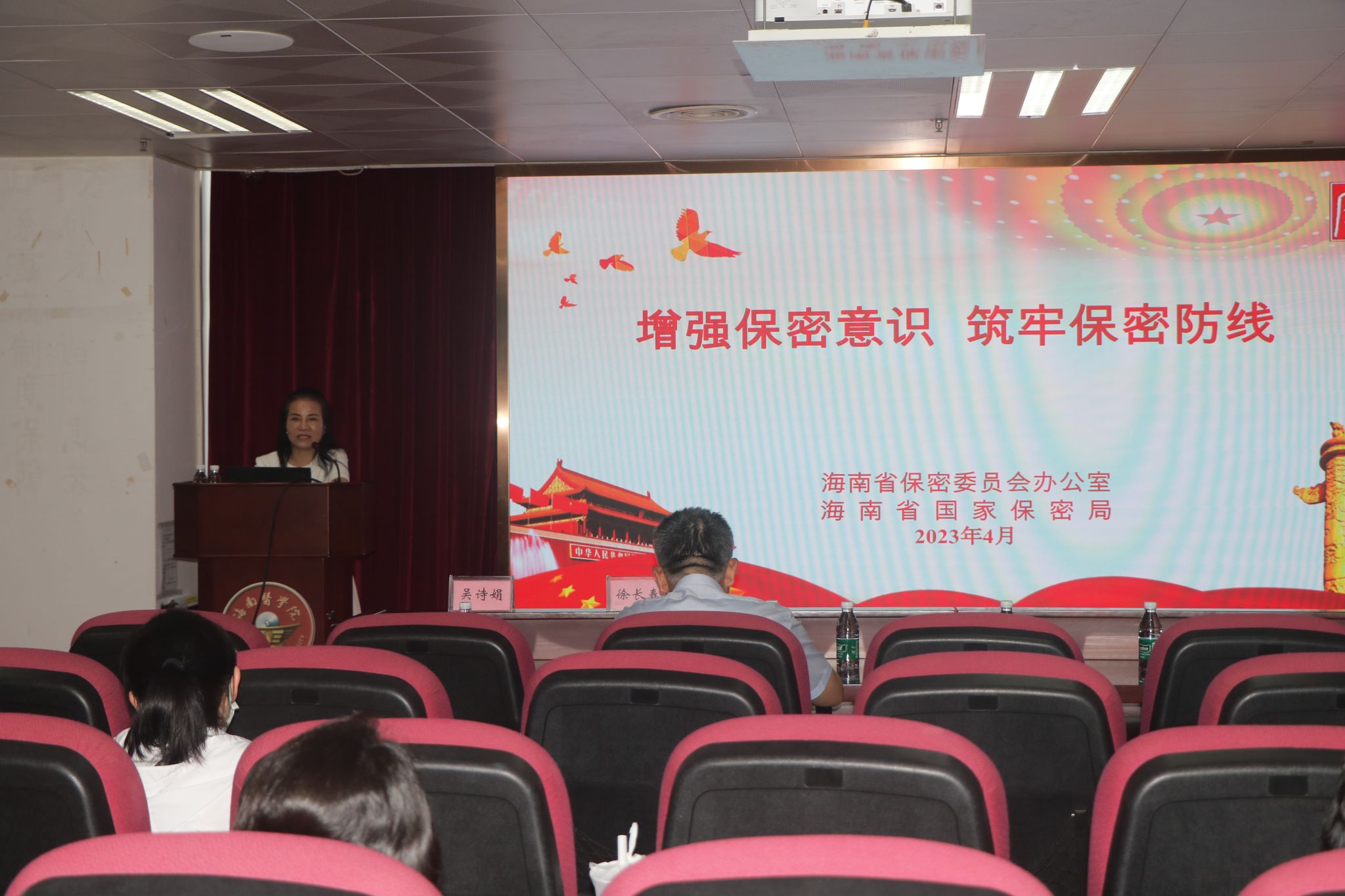 5月19日下午,我校在图书馆七楼学术报告厅举办2023年保密宣传教育月知识培训会,邀请省国家保密局副局长吴诗娟作保密知识专题辅导。培训会由党委办公室主任徐长春主持,党政职能部门、各二级学院相关负责人、干事共50余人参会。