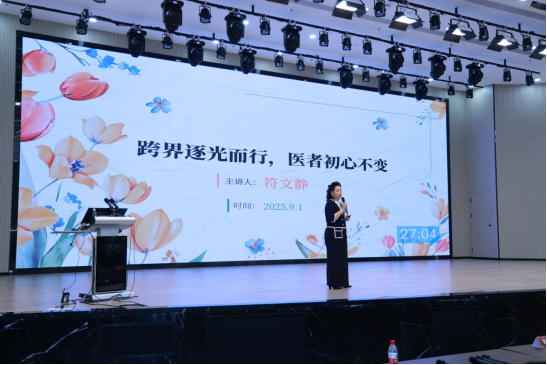 首位主讲嘉宾符文静校友(1985级临床医学专业)以《跨界逐光而行,医者初心不变》为题,分享了她从医学专业跨界到商业投资和公益事业的经历。符文静校友履历丰富,成就斐然,作为香港湾仔关爱服务及发展基金会会长、香港美利得国际投资有限公司行政总裁、海南生命科学医疗产业有限公司副董事长及行政总裁、海南金吉投资有限公司董事长,在分享中,她娓娓道来自己从海南到香港、从医学领域跨界到商业领域的创业历程。谈及母校,符文静校友满怀深情与感恩。她表示,母校不仅赋予了她系统的医学知识、塑造了她的人生价值观,更在灵魂深处镌刻了“敬畏生命、守护健康”的永恒烙印,这份医者初心如同明亮的灯塔,始终照亮着她跨界创业的漫漫征程,成为她不断前行、勇攀高峰的强大精神动力。她鼓励同学们要珍惜在校时光,努力学习专业知识,培养临床思维能力,为未来的医疗事业贡献自己的力量。