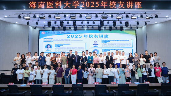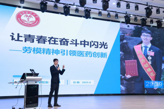 第四位校友嘉宾梁文棋(2010级中药学专业)以《让青春在奋斗中闪光:劳模精神引领医药创新》为主题,分享了自己在海医的学习以及毕业工作之后的成长经历,讲述了自工作以来深耕生物医药领域11年的奋斗历程。梁文棋校友担任广西达庆生物科技有限公司生产部技术总监,同时也是执业药师、国家一级创新工程师。自投身生物医药领域以来,在科研创新的道路上,他带领团队一路披荆斩棘,取得了令人瞩目的成果,他用青春和汗水诠释了奋斗的意义,用劳模精神引领着医药创新的潮流。2025年,梁文棋校友凭借在医药创新领域的卓越贡献,荣获了“全国劳动模范”的荣誉称号。他在报告中分享了自己在科研道路上的奋斗历程,讲述了面对科研难题时的困惑与坚持,以及取得突破时的喜悦与自豪。他强调,科研需要严谨的态度、创新的思维和不懈的努力。他勉励同学们能够勇于挑战自我,敢于探索未知,在未来的科研征程中,用拼搏和奋斗书写青春的华章,绽放出最绚烂、最耀眼的青春光彩!