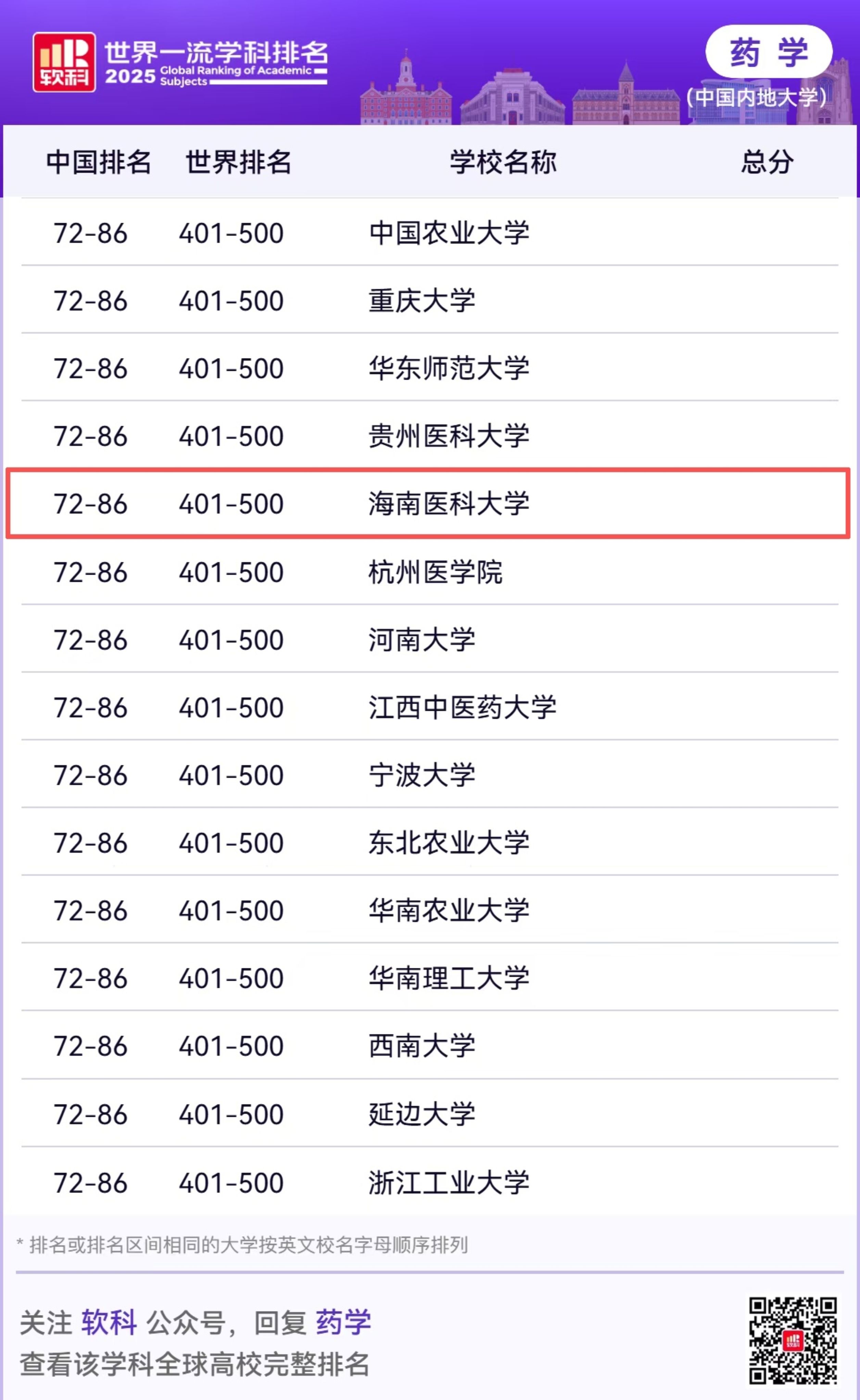 金秋传捷报,勠力结硕果。今天,高等教育评价专业机构——软科发布2025年“软科世界一流学科排名”,我校药学学科首次上榜,位列全球第401-500名!这是2025年年内我校首次入选软科世界大学学术排名(第901-1000名)、生物学与生物化学学科进入ESI全球学科排名前1%后,学校学科建设的又一重磅突破,标志着我校在世界一流学科建设新征程上再次实现“新突破”,在海医高质量发展的历史画卷上写下了浓墨重彩的一笔!