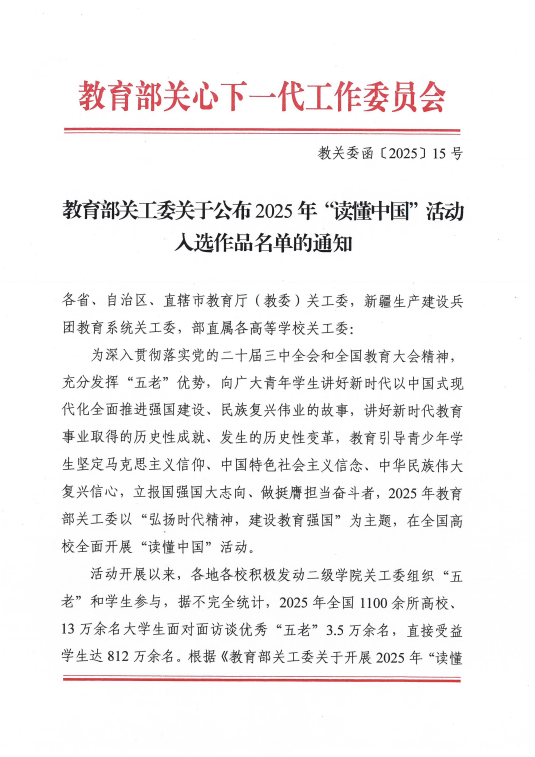 近日,教育部关工委公布2025年“读懂中国”活动评选结果,我校关工委凭借扎实的组织工作、丰硕的活动成果,入选“2025年‘读懂中国’活动表扬单位”,彰显我校在思政育人与代际传承中的突出成效。