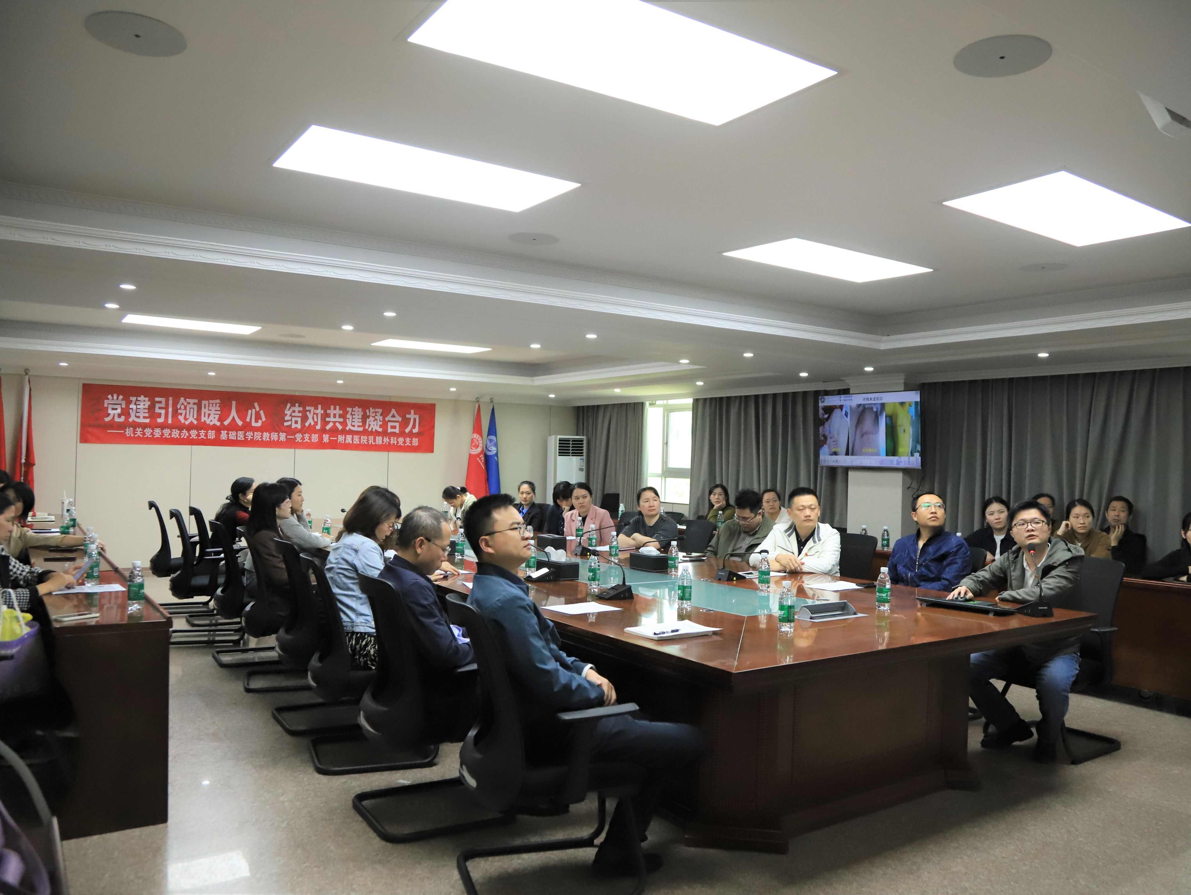 12月19日下午,机关党委党政办党支部联合基础医学院教师第一党支部、第一附属医院乳腺外科党支部,以“党建引领暖人心 结对共建凝合力”为主题,在文墀楼第一会议室及相关分会场举办结对共建活动。本次活动旨在深入贯彻落实新时代党的建设总要求,通过健康科普讲座与现场义诊服务相结合的方式,将党建工作成效转化为服务教职工健康的具体行动。