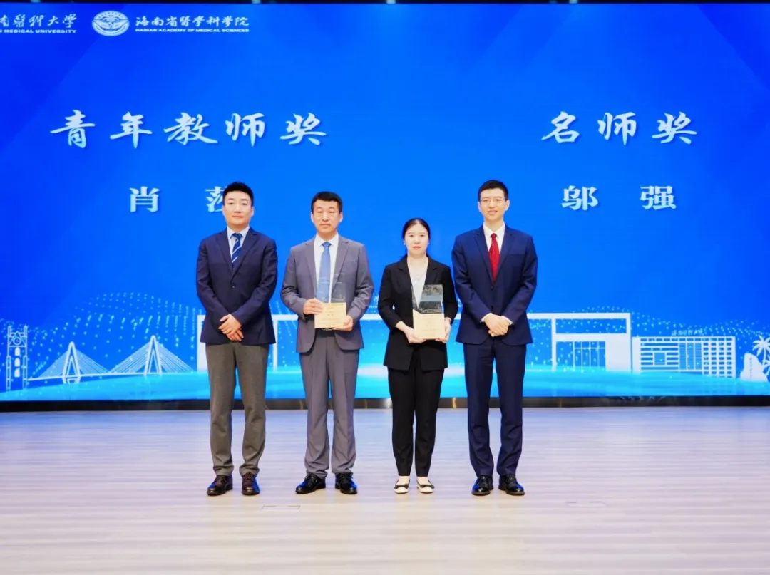 公共卫生学院教师肖莎、生命科学与医学技术学院教师邬强分别获得青年教师奖与名师奖。海南医科大学副校长丁治国与高飞总监共同为两位教师颁奖。