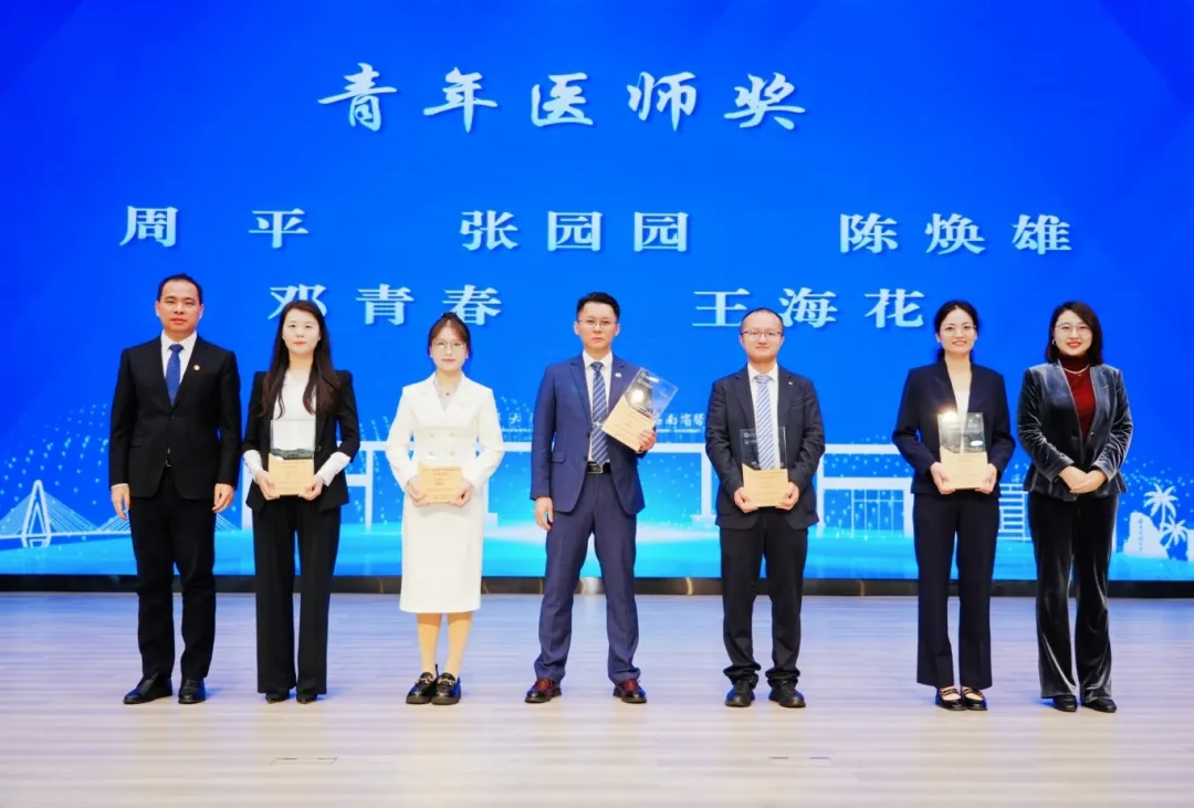 第一附属医院周平、张园园,第二附属医院陈焕雄、邓青春、王海花等五位医师获青年医师奖。海南医科大学副校长黄斌文与张琳总经理作为颁奖嘉宾,为五位青年医师颁授证书与奖杯。