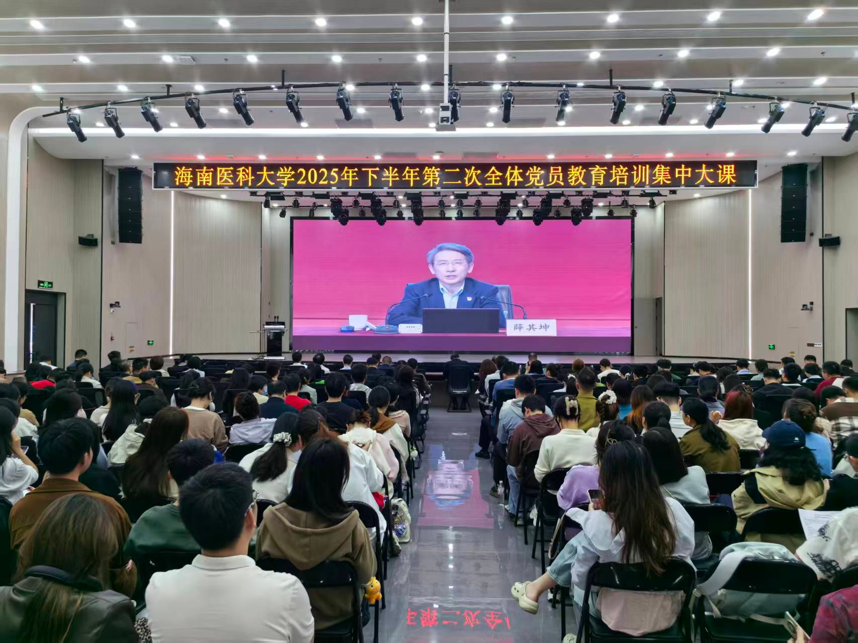 12月17日,海南医科大学开展2025年下半年第二次全体党员集中大课,集体观看中国科学院院士、南方科技大学校长薛其坤同志所作的题为《追求卓越矢志报国——在新征程上践行共产党员的初心与使命》专题报告。在海南自贸港12月18日封关运作进入冲刺倒计时的关键节点举办此次活动,旨在深入学习贯彻习近平新时代中国特色社会主义思想,强化党员教育培训实效,推动党建与医学教育、科研、服务深度融合。
