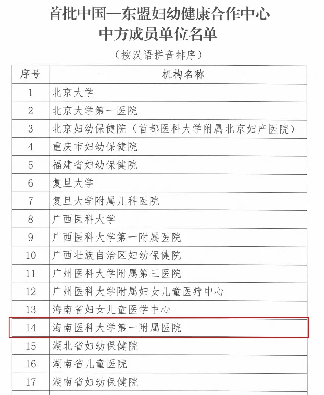 近日,国家卫生健康委妇幼健康中心正式公布首批中国—东盟妇幼健康合作中心中方成员单位名单。海南医科大学第一附属医院(以下简称“海医一附院”)成功跻身其中,这既是国家卫生健康委员会对医院多年来深耕妇幼健康事业、践行公益使命的充分肯定,也是对医院在国际交流合作领域潜力与担当的高度认可。