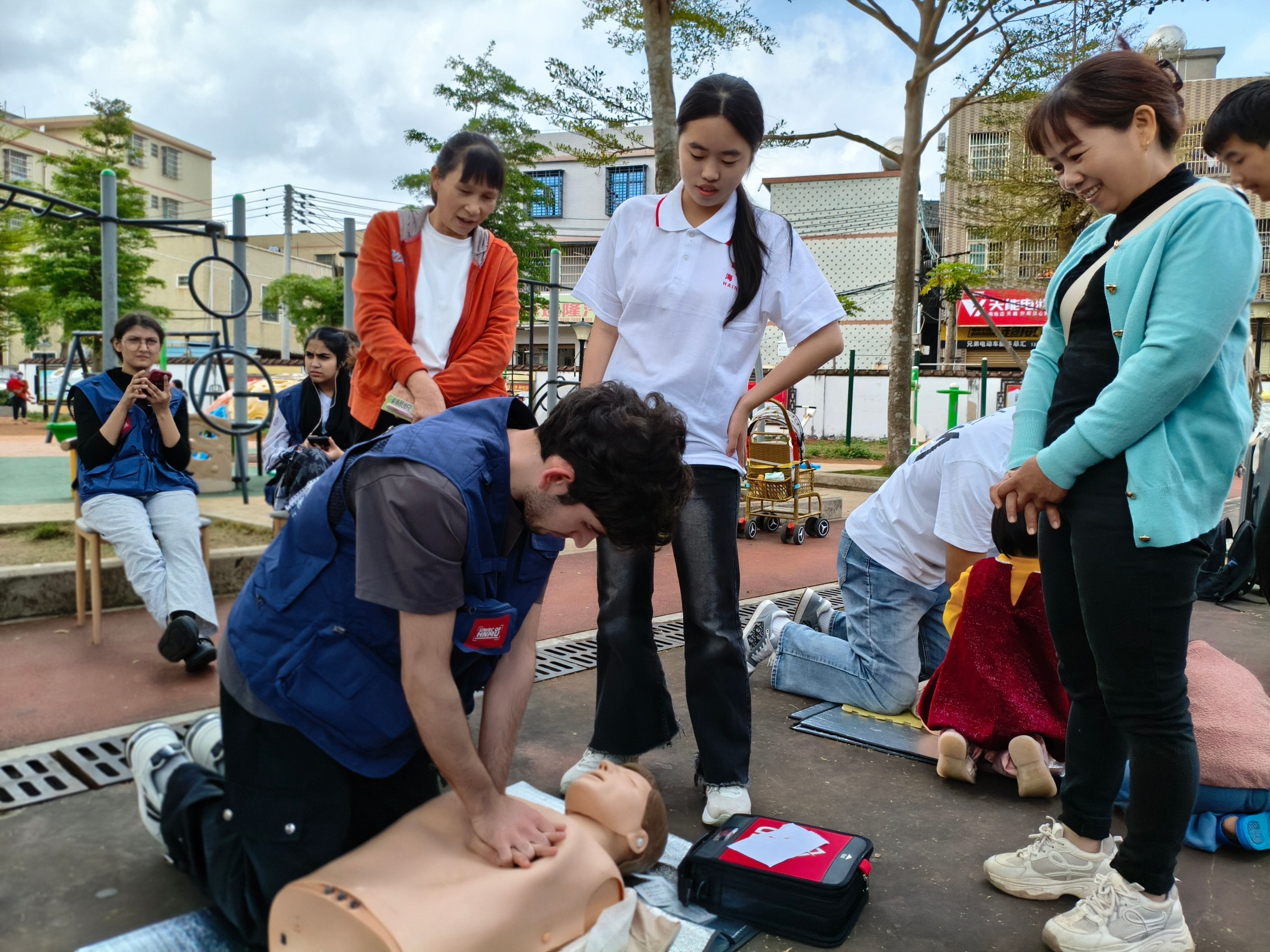 活动以“跨文化健康服务集市”为核心,设置四大主题板块,满足居民多样化需求。一是中医养生智慧角:中医专家与志愿者现场演示针灸推拿、穴位按摩;二是急救技能培训站:通过心肺复苏(CPR)模拟演练、伤口包扎教学,居民在“情景式”互动中掌握急救技能;三是国际健康文化展:图文展板与留学生讲解结合,展示印度瑜伽、日本膳食指南、中东饮食文化等健康习俗;四是慢性病管理咨询台:医学专家为居民提供高血压、糖尿病管理方案及个性化饮食建议。