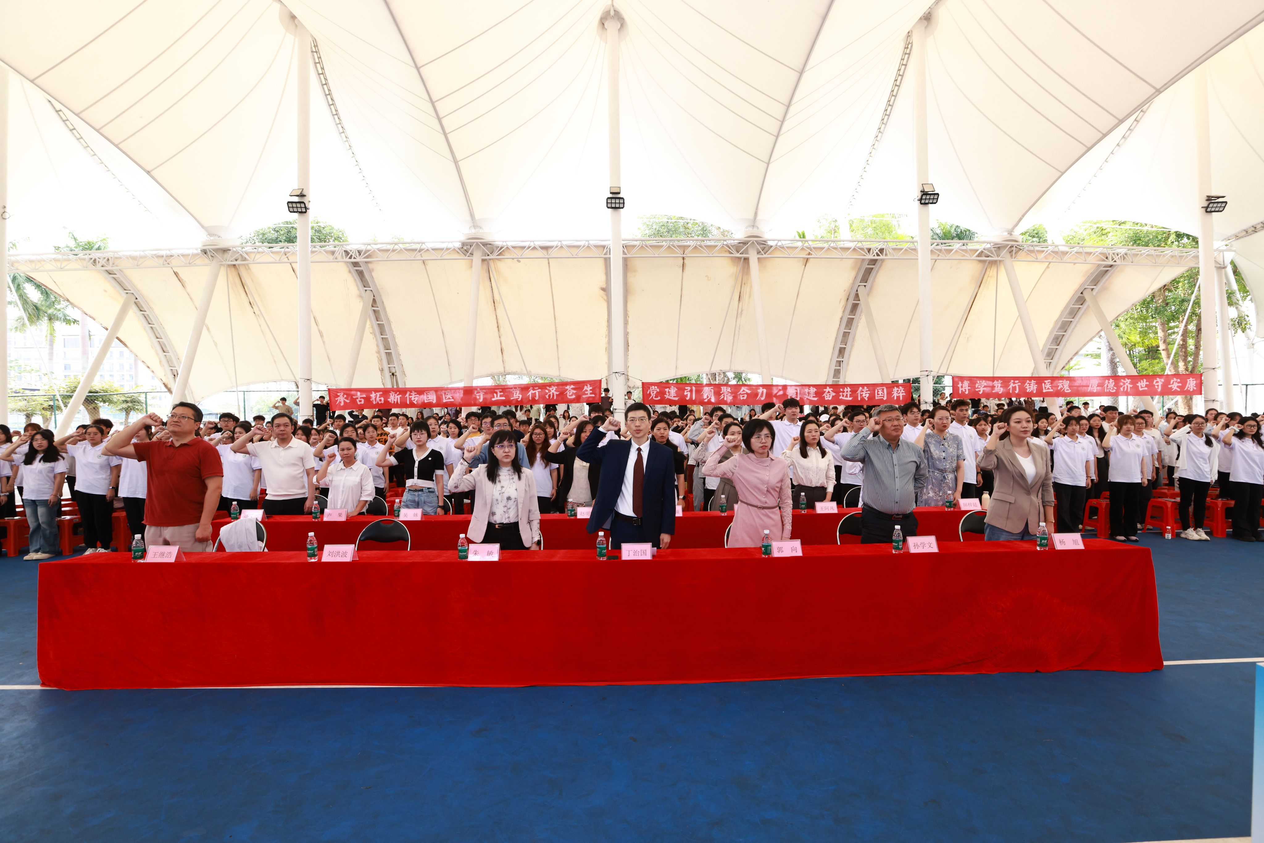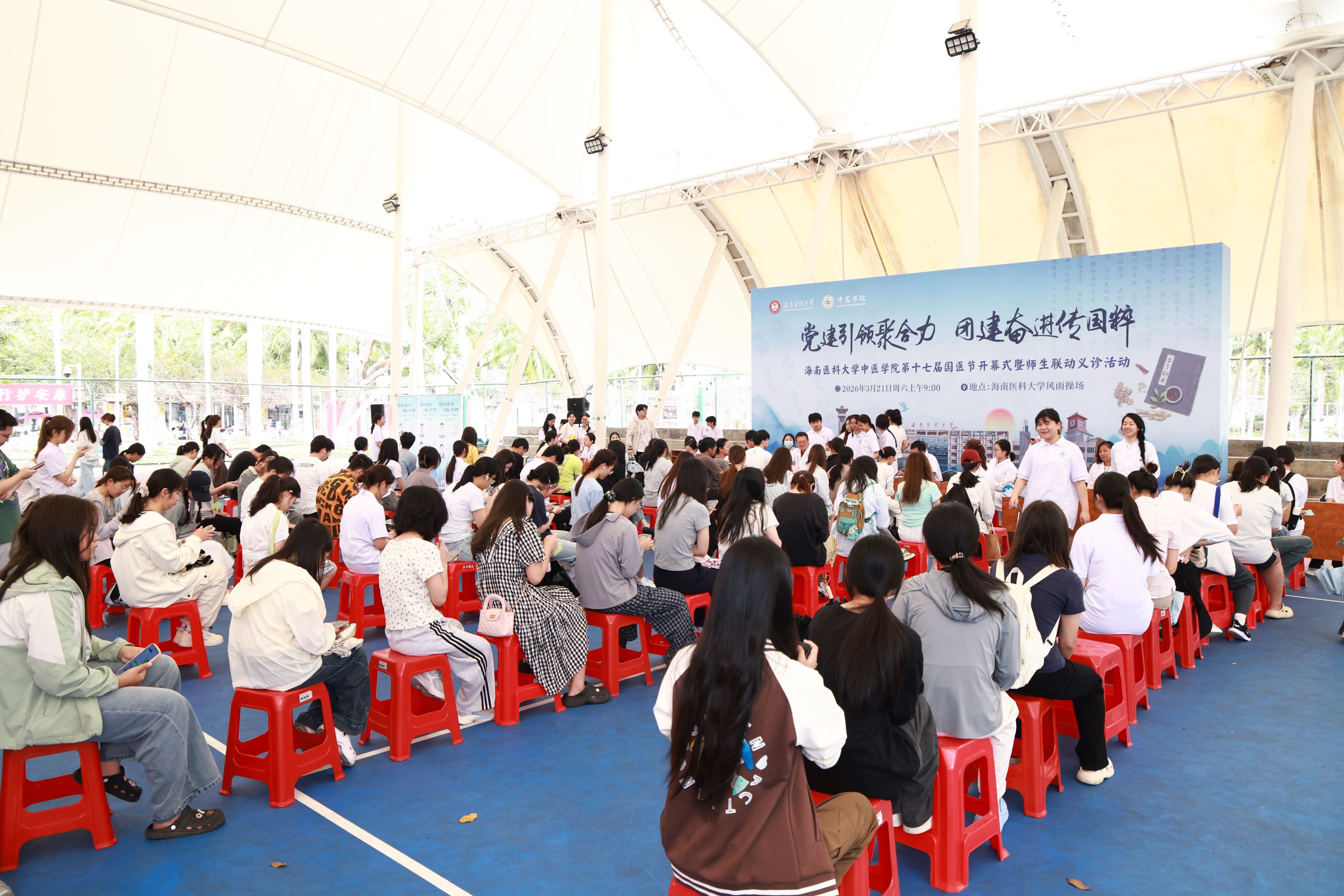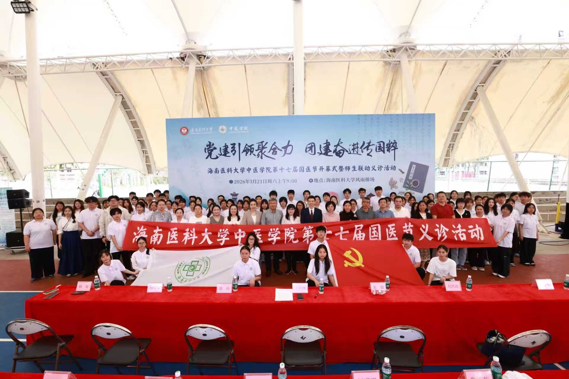 3月21日,海南医科大学中医学院第十七届国医节在学校风雨操场开幕。本届国医节以“党建引领聚合力 团建奋进传国粹”为主题,我校副校长、中医学院院长丁治国,第一联合党委书记郭向,第一联合党委副书记朱敏,学院党委委员、副处级辅导员孙学文,学院团委书记杨旭出席开幕式,与学院师生代表齐聚一堂,共赴中医药文化盛宴,共启国粹传承创新新征程。