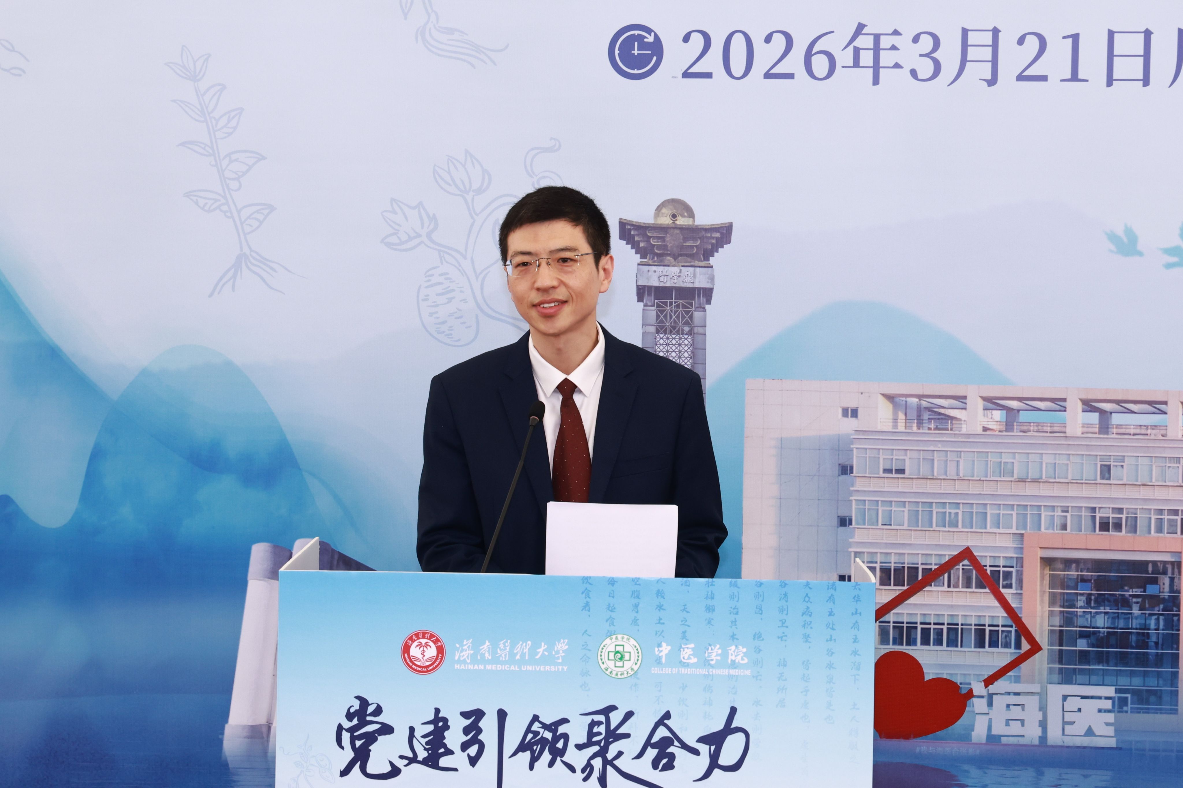 丁治国作致辞,他指出本届国医节是中医学院以正确政绩观引领办学实践的生动体现。学院始终坚守“功成不必在我,功成必定有我”的责任担当,把人才培养、中医药传承创新、服务健康海南建设作为核心追求,不图虚名、务求实效。他强调,2026年是学院高质量发展的关键之年,教育部中医学专业认证、中医学博士点申报两大重点工作是学院发展的“双引擎”,既是检验办学水平的“试金石”,更是同学们成长成才、未来深造与就业的“登高梯”,需要全体师生同心同向、合力共为。他勉励全体学子铭记“大医精诚”,敬畏生命、锤炼医术,坚守医德、心怀温度,努力成长为懂经典、精医术、有温度、敢担当的新时代中医人,在传承国粹中践行使命,以青春力量助力中医药事业高质量发展。