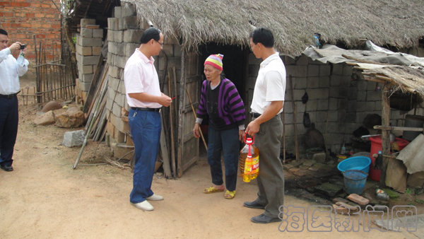 2月4日,由我校组织人事部推荐,海南省省委组织部选派的“联村进企”农村工作指导员李军,在春节即将来临之际,受学校组织人事部的委托,在乐东县大安镇镇领导、大安镇昂外村村支书的带领下,与同组的农村工作指导员省财厅何国民处长、省国土资源厅祝朝俊处长、省社科联彭罗生科长到昂外村给困难群众和困难党员带去慰问品和慰问金,对昂外村全体村民表示亲切慰问和节日的祝福。