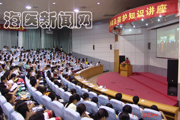 何副主任结合自己亲身经历的地震灾害紧急救援队北川救援纪实情况,给同学们讲述了在地震时的安全逃生方法以及救助他人的方法;他还从地球的构造分析了地震、海啸发生的原因,驳斥了弄得人心惶惶的“海南将于9月份发生大地震”的谣言。刘老师则从食品卫生、饮食卫生、环境卫生、病媒生物防制、消毒处理、尸体处理到健康教育以及心理危机干预等八个方面给我们讲解了地震灾区的卫生防疫知识。