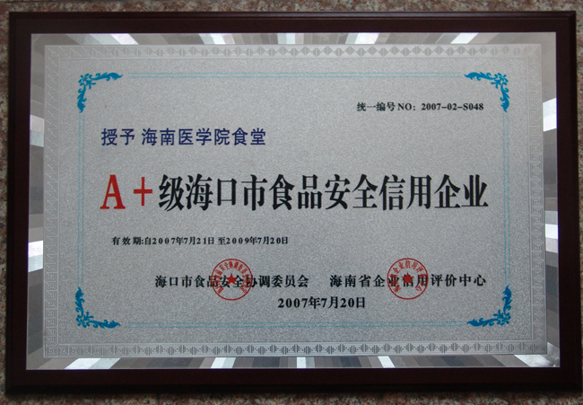 12月11日上午,在海口市市政府召开了海南省食品安全信用等级表彰大会,全省各类加工、制作或出售食品的500多个单位参加了此次会议,我校学生食堂被评为海南省食品安全信用等级A+。据悉,在与会的500多个单位中,只有50多个单位被评为海南省食品安全信用等级A+。