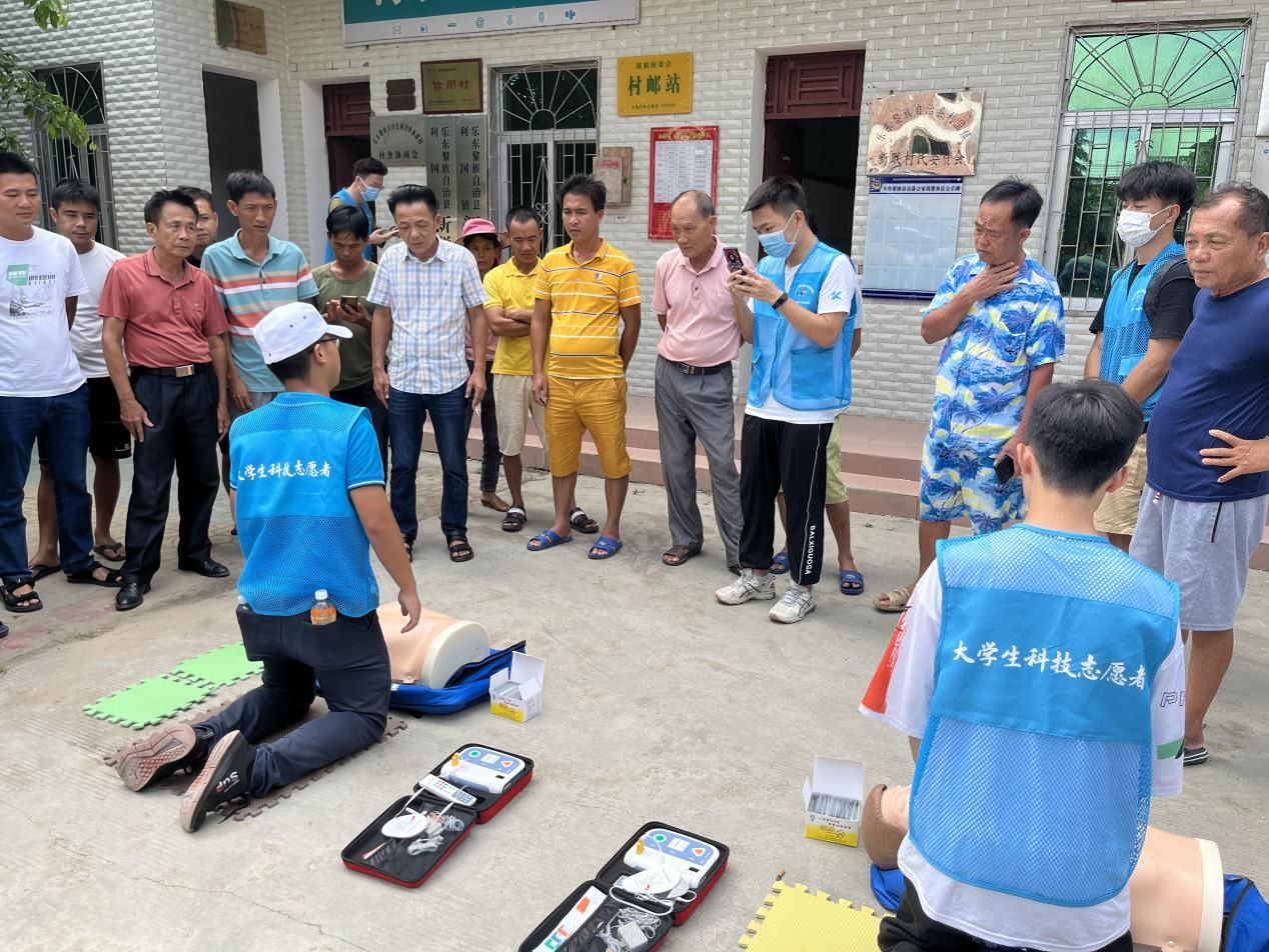 为了解当地村民科普知识普及程度,促进当地农村基层卫生和安全状况的改善,爱心服务团成员深入乡村,开展科普宣讲及调研活动,张贴环境保护和禁毒防艾宣传海报。他们走村串户进行问卷调查,向村民发放有关卫生健康、生态环境、乡村文化、禁毒防艾等知识的宣传手册。走访调查期间,队员结合调研内容,耐心为村民们传授并演示心肺复苏和使用AED的正确方法,帮助乡亲们正确理解并能够将心肺复苏与AED运用于危急时刻。