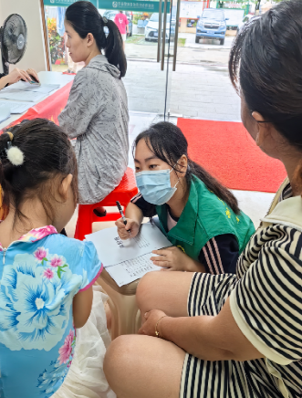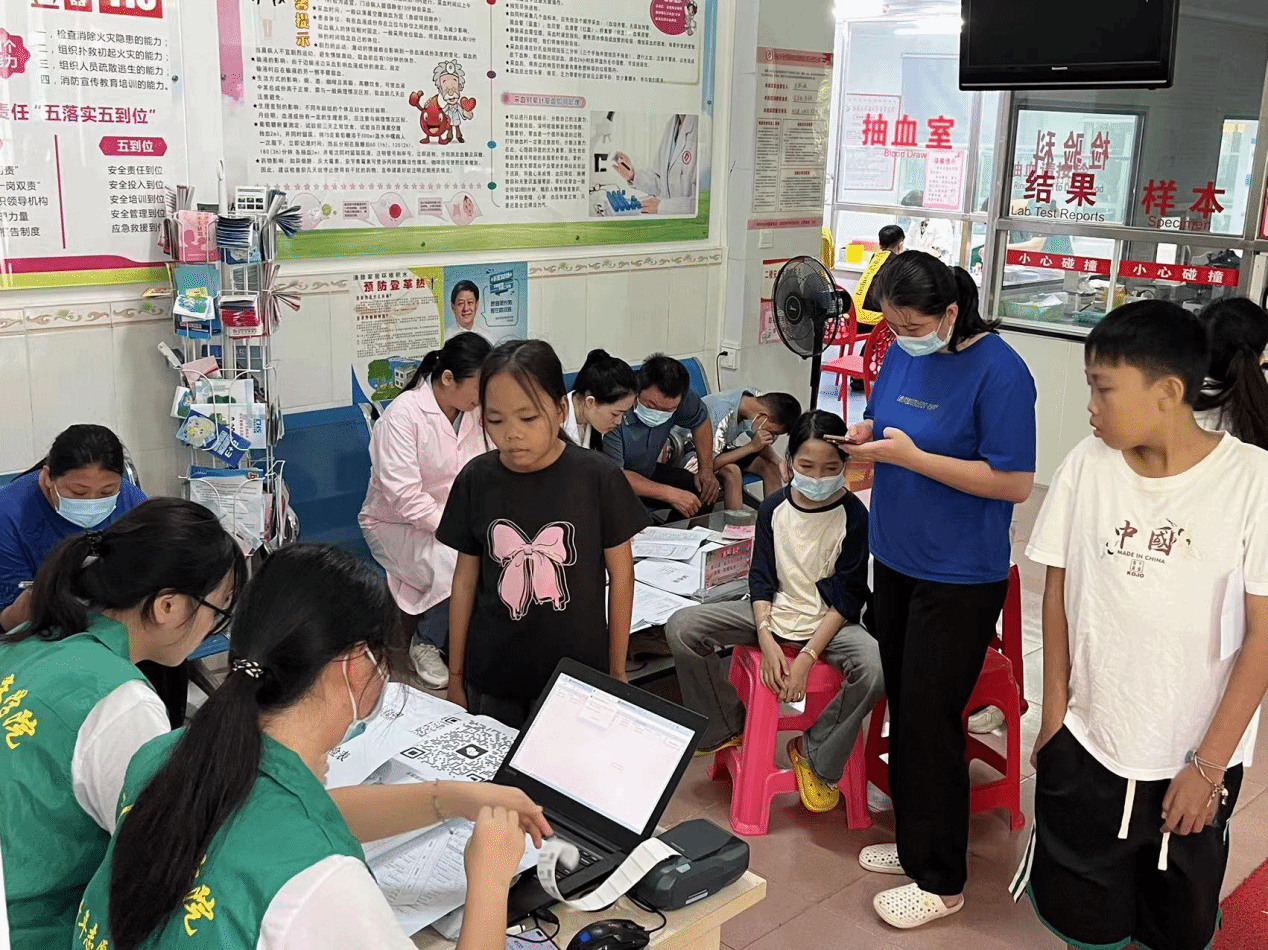 在义诊期间,一位患儿的母亲引起了我们的关注。她站在人群中,眉头紧锁,皮肤黝黑,紧紧握着孩子的小手。在队员登记个人信息时,她提到孩子今年10岁了,这几年身体不好,一直在休学,希望他的身体可以好一点,今年9月可以重返校园读小学二年级。由于长期需要输血和排铁治疗,地贫患儿的身体发育明显落后于同龄人,瘦弱的身影在人群中显得格外的孤单,母亲的眼里满是伤心与无奈。还有一对带着5岁患儿来体检的夫妇,父亲紧紧握住队员的手,向每位队员们表达感谢。眼前的这一幕幕,激发了队员们向“地贫”说“不”的斗志,坚定了我们为地贫患儿提供温暖的关怀和帮助的初心。希望我们的努力能点亮他们生命中的一盏明灯,照亮他们通往健康的道路。