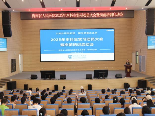 5月29日上午,附属海南医院(临床医学院)在教学楼多功能厅召开“白袍执甲赴新程 椰岛悬壶炼真功”2025年本科生实习动员大会暨岗前培训启动会。我校党委副书记、海南省人民医院党委书记马志健,我校副校长、海南省人民医院党委副书记、院长张本,临床医学院常务副院长张秀峰,以及相关职能部门负责人、教师代表到场。我校三百余名本科实习生医学生齐聚一堂,共同见证他们职业生涯中的重要起点。会议由临床医学院党委副书记王晖慧主持。