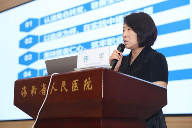 教学培训部部长乔平则聚焦实习学习目标、考核标准、学习纪律等核心内容进行了详细阐述。她要求同学们端正学习态度,积极主动参与临床诊疗全过程,以高度的责任心和敬业精神,认真完成各项实习任务,提高临床思维能力和实践操作技能,积累临床经验。