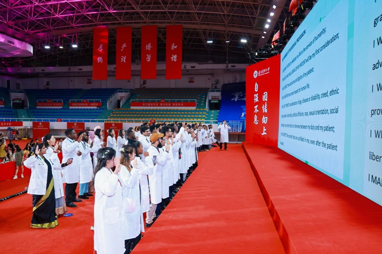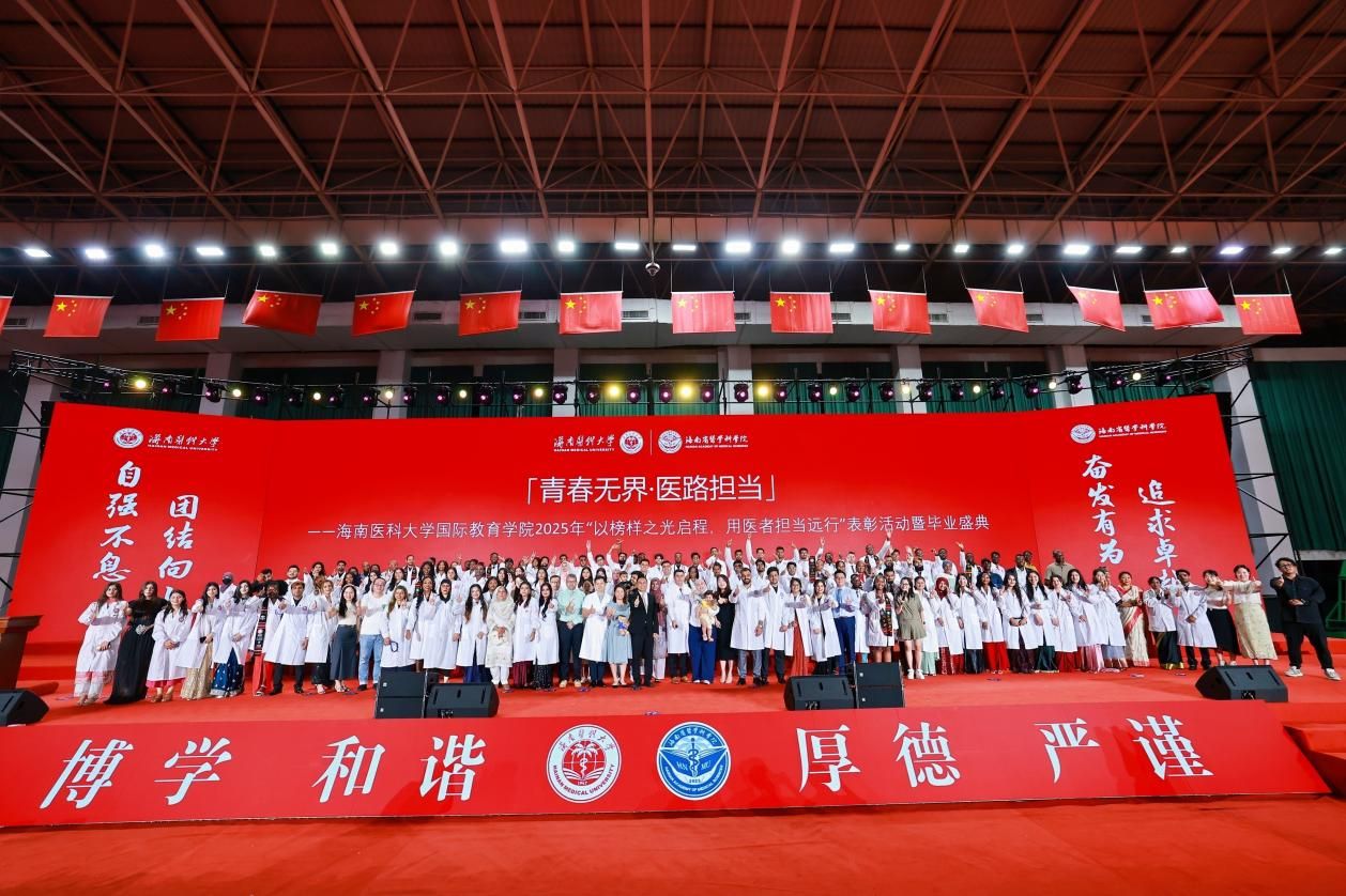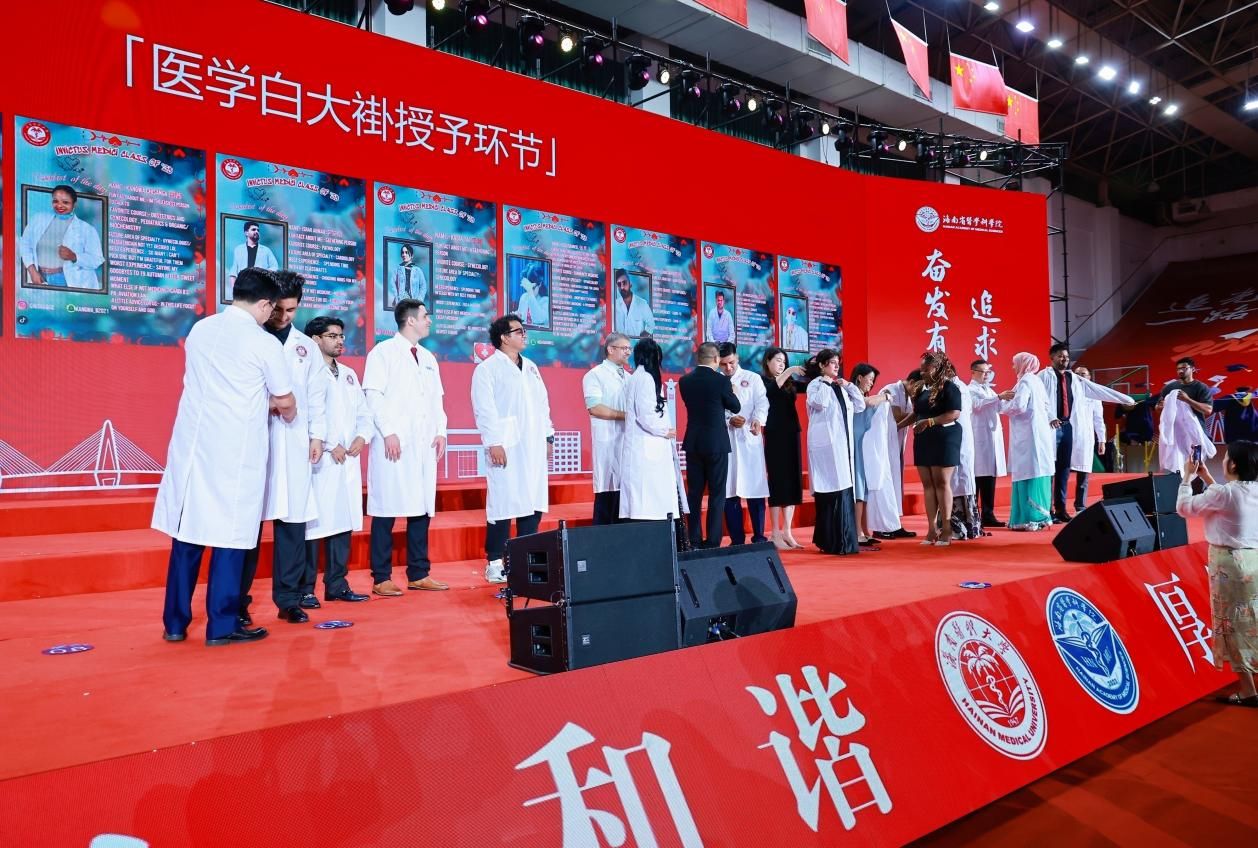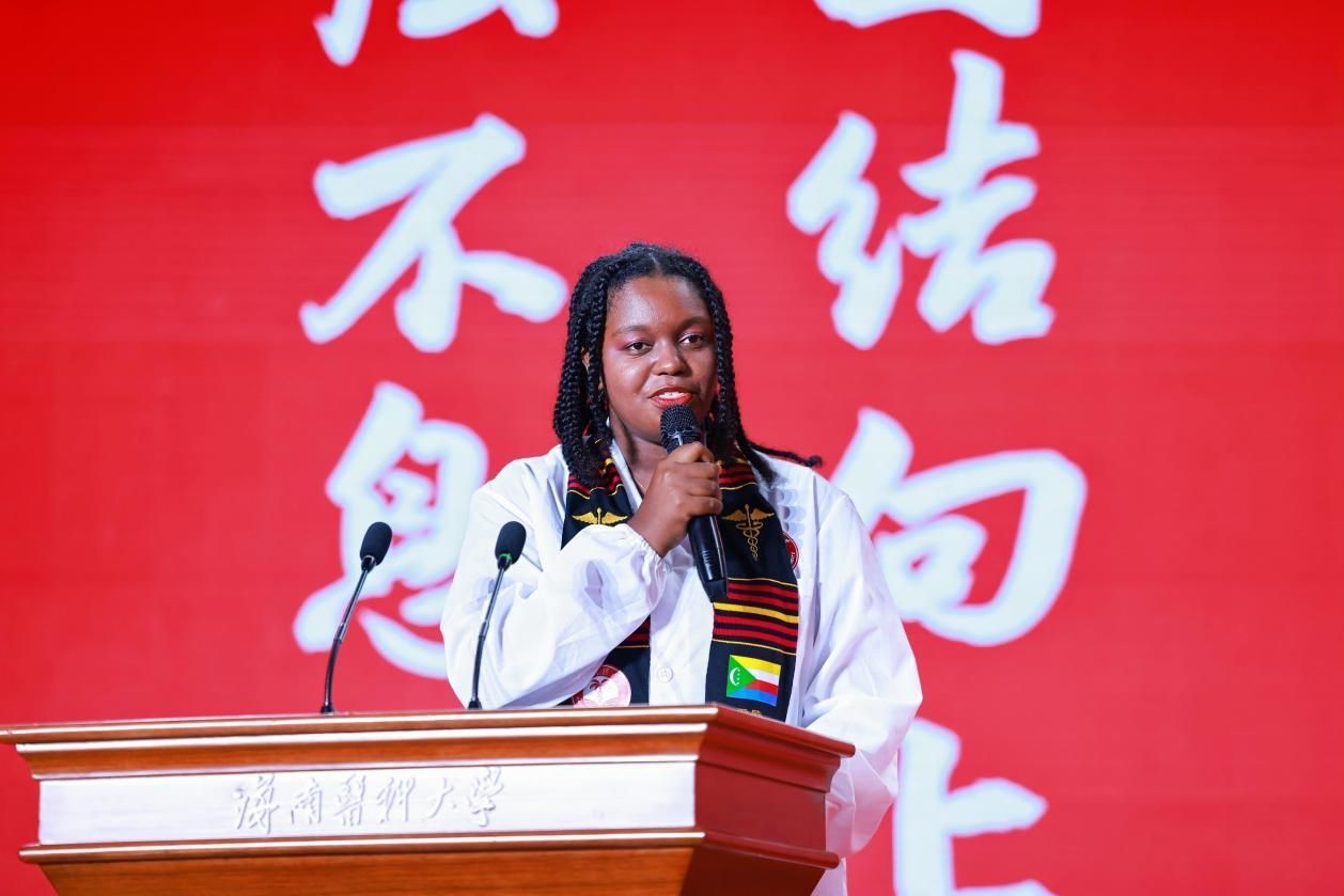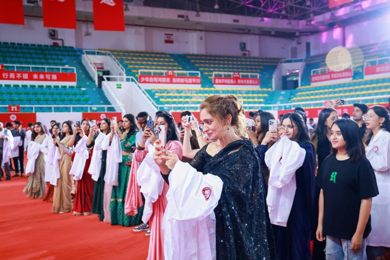 “青春启程·医者誓言”篇章将典礼推向高潮。朗诵《医路无界·青春同航》中,“健康所系,性命相托”的誓词响彻礼堂;留学生传统文化歌曲串烧海南民谣《抓鱼歌》《青玉案·元夕》和豫剧《谁说女子不如男》等节目展现了留学生的语言能力和对中国传统文化的热爱;巴基斯坦留学生带来的舞蹈表演展现了浓郁的异域风情;非洲留学生的自创歌曲《Graduando》引爆全场。