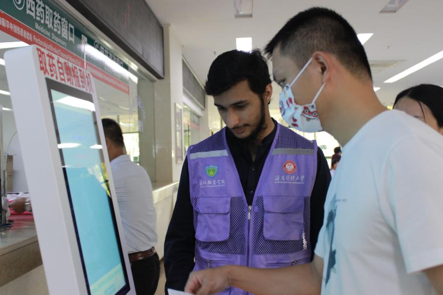 万宁市人民医院挂号处,巴基斯坦留学生宋怀安协助老年患者使用自助设备