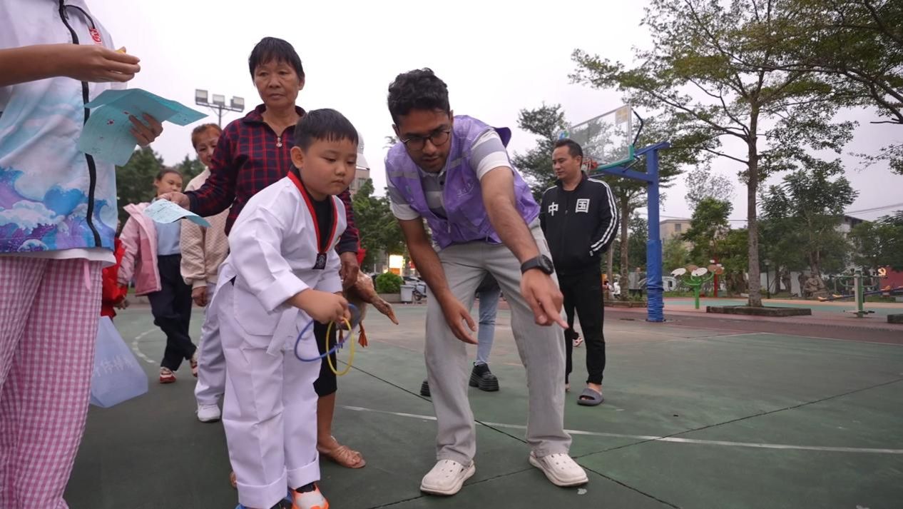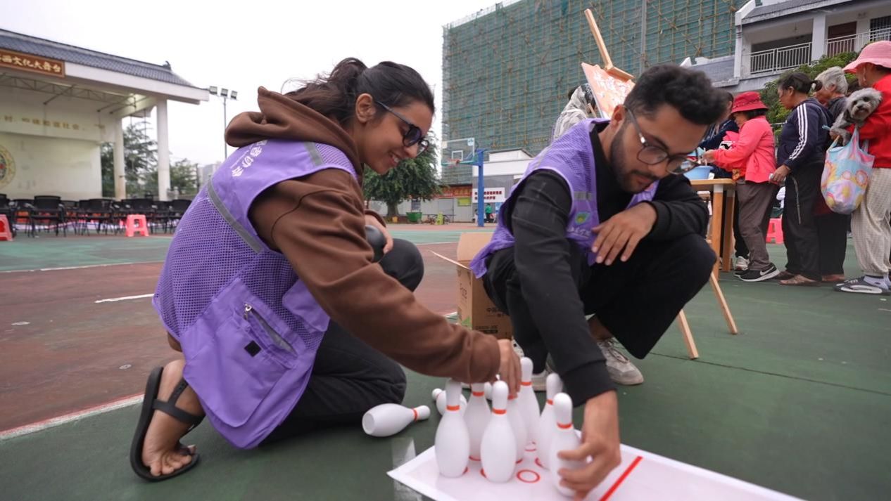文艺汇演落幕,趣味游园活动随即热闹开启。国际志愿团队的留学生们早已按分工抵达各个游戏区,用行动守护长者的游园乐趣。在“趣味保龄球”区,巴基斯坦籍志愿者程飞飞(ARSHAD NIMRA)正协调其他两位志愿者们忙着摆放保龄球道具。看到78岁的张奶奶想参与却因行动不便犹豫时,她立刻上前扶住奶奶的胳膊,耐心讲解规则:“奶奶,您拿着这个球,轻轻往前推就好,我帮您扶着。”在她的鼓励下,张奶奶成功击倒3个球,开心得连连拍手,程飞飞也跟着笑起来:“奶奶您真棒!’‘小球‘夹’好运”区里,巴基斯坦籍志愿者陆则一(BILAL HAMMAD)默契配合小朋友一起拿起筷子夹小球,佐雅(CHAUDHARY ZOYA)举起印章,在卡券上认真盖下打卡印记,还不忘用手比个“耶”的手势。最热闹的“套鸭子”区,巴基斯坦籍志愿者罗彬(KHALID BILAL BIN)、世杰(MUNEER SIRAJ)严格把控秩序:罗彬在场地外围划定排队线,场地内把控鸭子行走路线,用中文和手势引导长者按顺序参与;世杰则负责发放套圈,还特意提醒“每人3个圈,慢慢扔,看准了再投”。而在拍照打卡区,老挝籍志愿者康善(CHONGCHUEKENGTHOR KAOXOUA)和杨颖(PHONGMANY SOUNITA)、柬埔寨籍志愿者宋碧妮(SVAY KUNTH PIDOR),成了居民们的“专属摄影师”。康善举着手机,耐心帮长者调整姿势,还教长者比“爱心”手势;宋碧妮则拿着“重阳安康”“敬老爱老”的手举牌,帮长者搭配拍照道具,偶尔还会用老挝语、柬埔寨语说一句“身体健康”“节日快乐”,引得长者一阵好奇声“小姑娘,你说的是什么呀?真好听”,现场笑声不断。在便民义诊区,国际志愿团队的留学生们充分发挥医学专业优势,协助苍西社区卫生服务站的医护人员开展服务。
