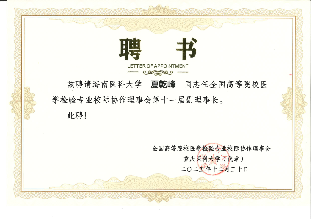 随后,会议颁发了理事长和副理事长证书,我校夏乾峰教授被聘请为全国高等院校医学检验专业校际协作理事会第十一届副理事长。