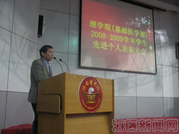 1月7日下午,理学院(基础医学部)【以下简称“理学院”】2008-2009学年度学生先进个人表彰大会在多功能报告厅举行。学院领导符史干、蔡望伟、易西南应邀出席大会,09级班级导师,学院办公室全体教师及学院全体同学参加了本次表彰大会。大会由学院办公室黄泽云主任主持。