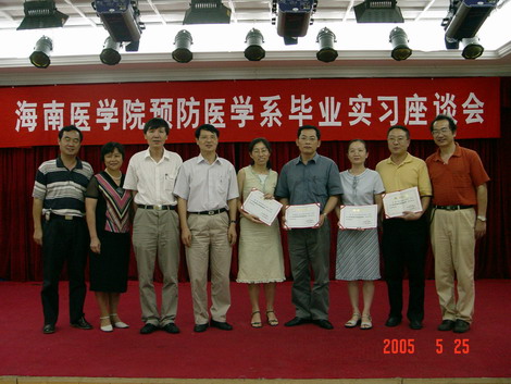 5月25日下午,在海口市奥斯罗克大酒店三楼会议室举办了预防医学系毕业生实习座谈会。参加会议的单位有海南省疾病预防控制中心、海口市疾病预防控制中心、海南省妇幼保健院、海口市妇幼保健院。学院领导焦解歌院长 出席了会议,并发表了讲话。各实习单位领导及带教老师畅所欲言,对2000级预防本科班毕业生实习的情况作了总结,对今后的实习安排以及专业培养计划提出了许多宝贵的建议。 最后,焦解歌院长为获得优秀教学实习单位和优秀教师称号的单位和个人颁发了奖牌和证书。