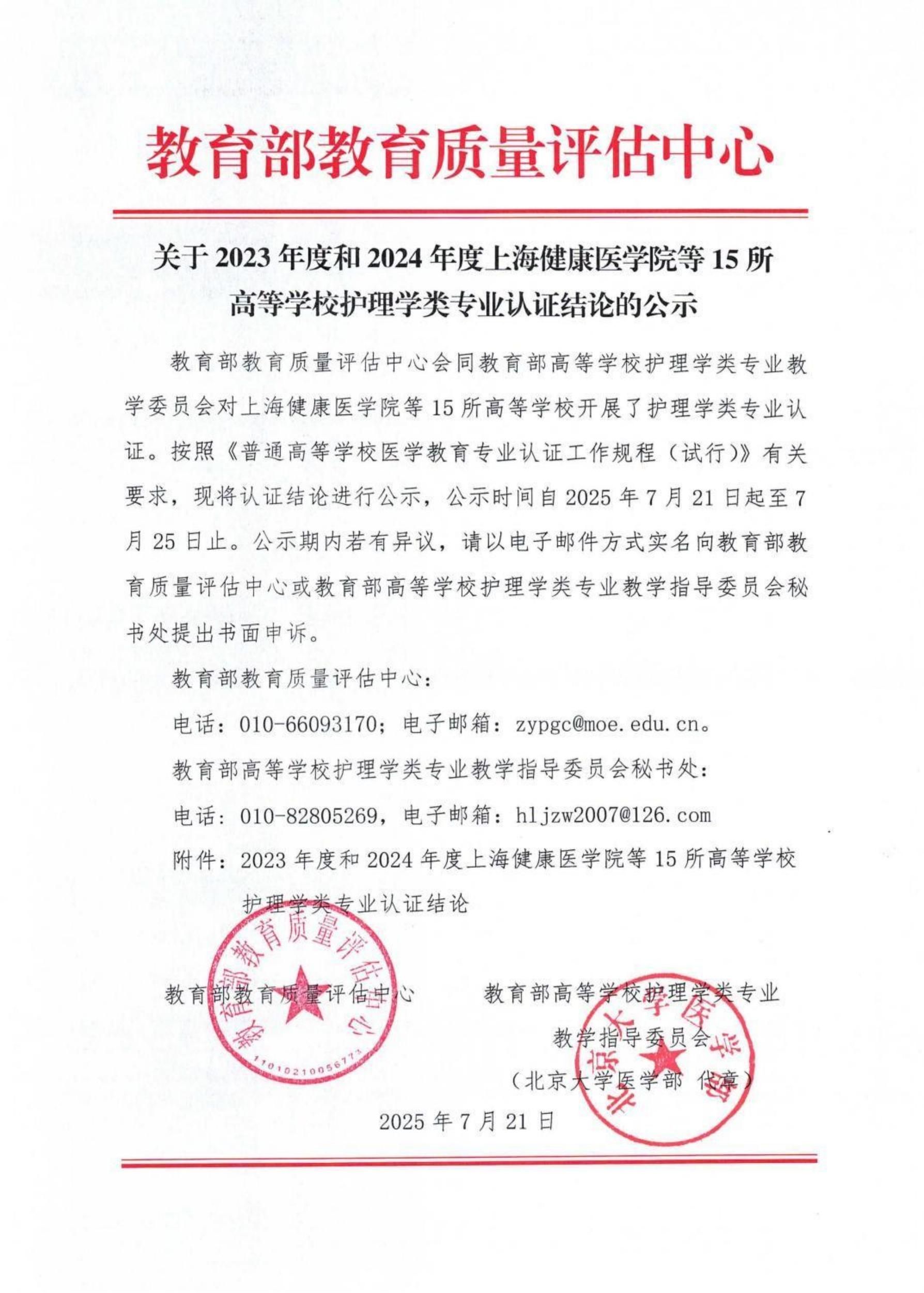 近日,教育部教育质量评估中心、教育部高等学校护理学类专业认证工作委员会公示了2024年高等学校护理学类专业认证结论,我校通过教育部护理学专业认证,有效期为6年,即至2031年3月。这是我校护理学专业建设发展历程中的一个重要里程碑,标志着护理学专业人才培养质量获得了国家权威专业机构的认可。