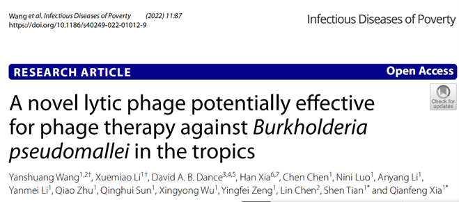 该研究成果以《从热带地区分离的新型烈性噬菌体具有高效治疗类鼻疽伯克霍尔德菌的潜力》为题,发表在全球热带医学领域影响因子排名第一的中科院1区Top期刊《贫困所致传染病》上。该校热带医学院2019级博士研究生王彦双和2020级硕士研究生李雪苗为本文的共同第一作者,该校教授夏乾峰及讲师田申为共同通讯作者。