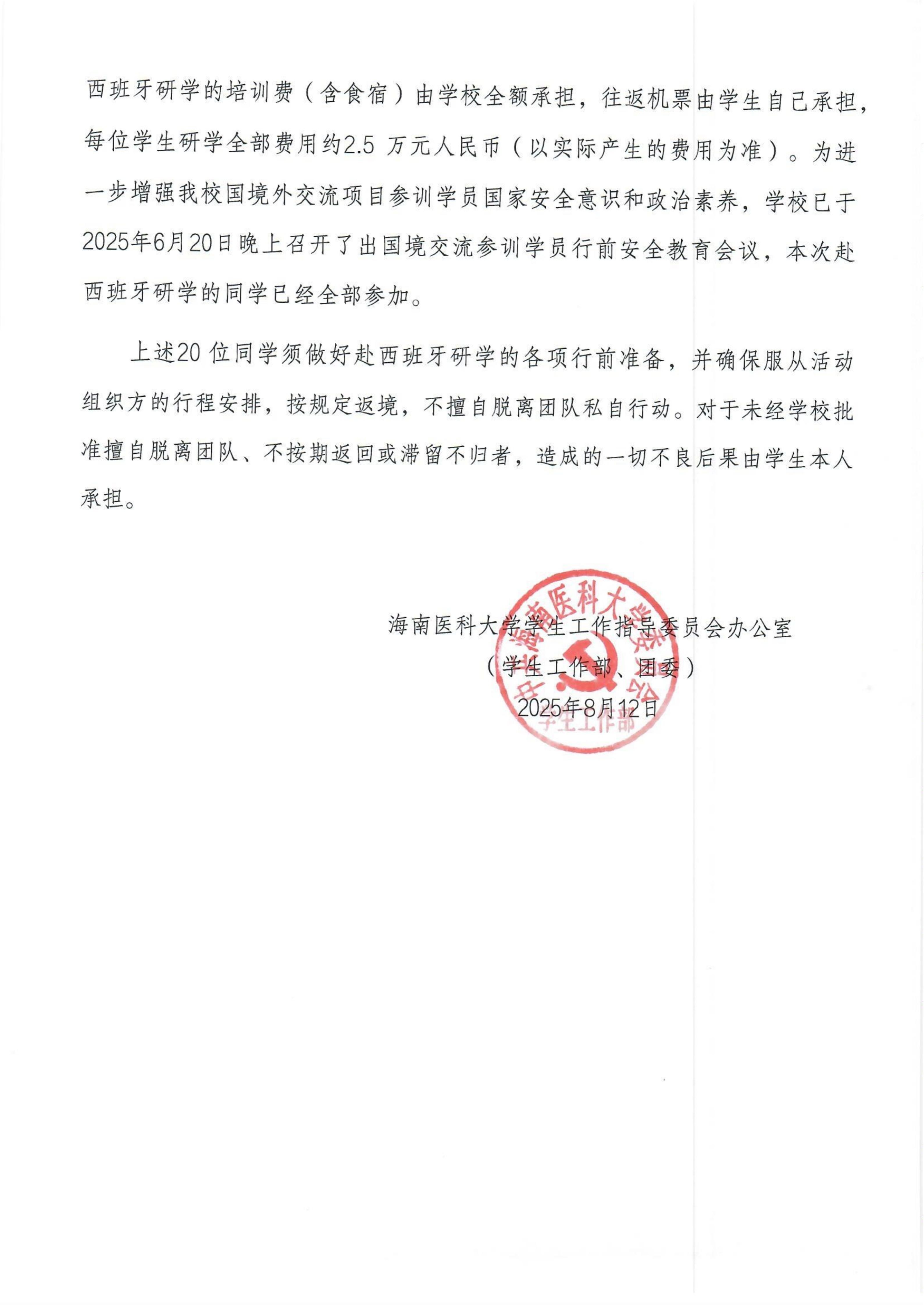 海南医科大学学生工作指导委员会办公室关于选派20名学生赴西班牙交流学习的通知