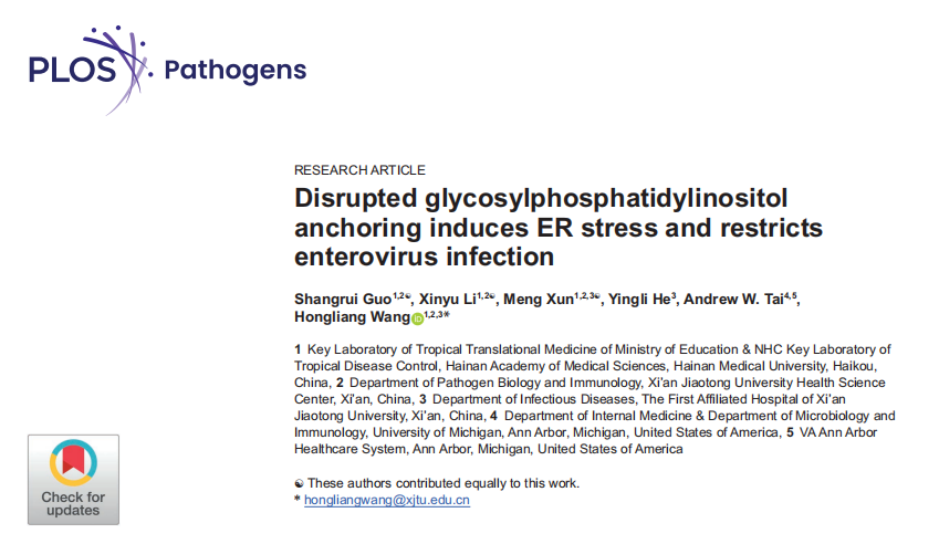 近日,海南医科大学热带转化医学教育部重点实验室王洪亮教授团队在国际病原学顶级期刊(中国科学院一区top)《PLOS Pathogens》上发表题为《Disrupted glycosylphosphatidylinositol anchoring induces ER stress and restricts enterovirus infection》的研究论文。该研究通过全基因组CRISPR筛选,首次揭示了糖基磷脂酰肌醇锚定系统在肠道病毒感染过程中的关键作用,并阐明了其通过诱导内质网应激及激活RIDD通路降解病毒RNA的新机制。