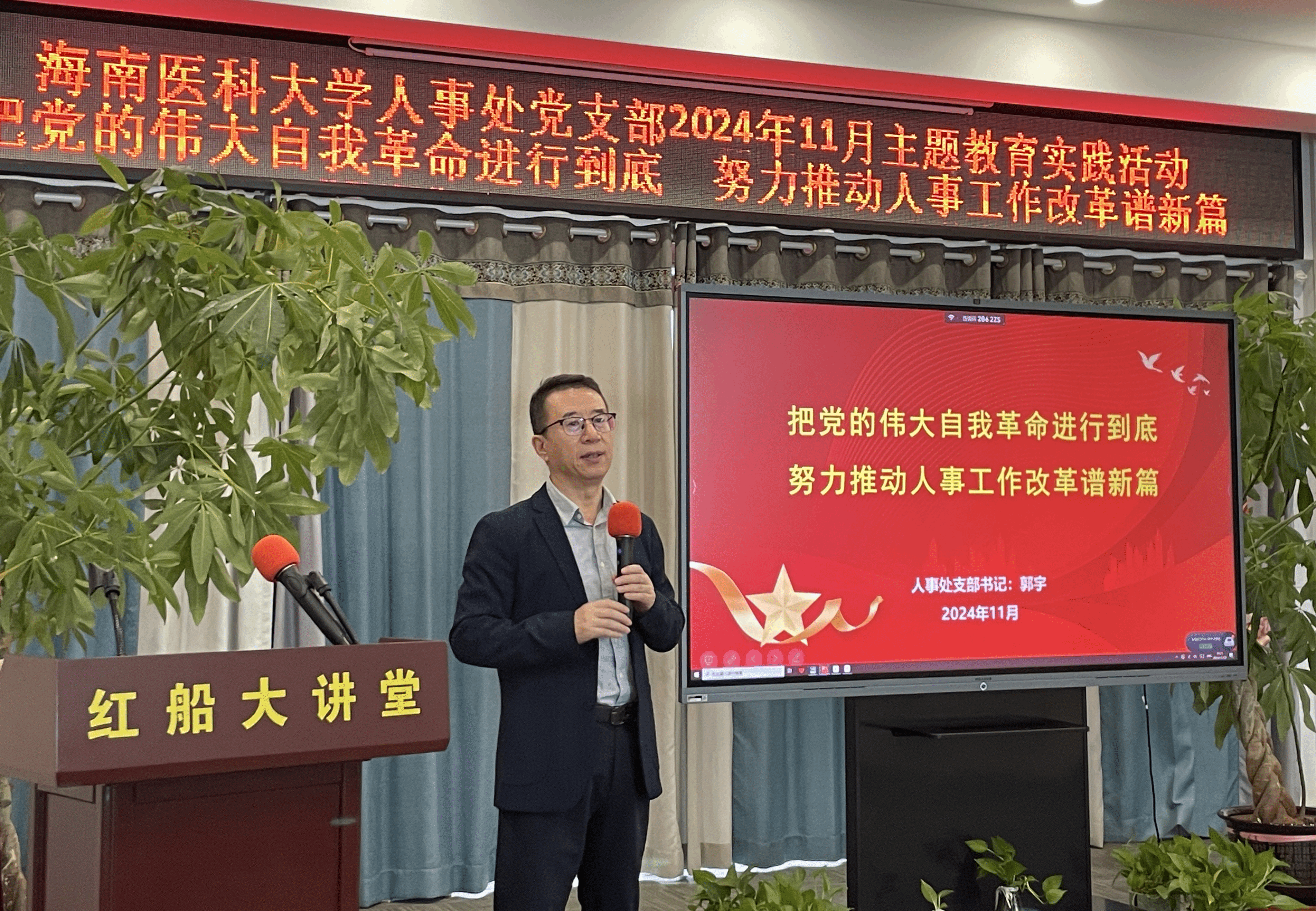 人事处支部书记、处长郭宇以“把党的伟大自我革命进行到底,努力推动人事工作改革谱新篇”为题,为支部党员讲授党课。他以2024年《求是》杂志刊登的习近平总书记的重要文章《时刻保持解决大党独有难题的清醒和坚定,把党的伟大自我革命进行到底》为切入点,阐述了解决大党独有难题必然是一个长期而艰巨的过程,在此过程中解决好六大难题是关键,即如何始终不忘初心、牢记使命,始终统一思想、统一意志、统一行动,始终具备强大的执政能力和领导水平,始终保持干事创业精神状态,始终能够及时发现和解决自身存在的问题,始终保持风清气正的政治生态,这是实现新时代新征程党的使命任务必须迈过的一道坎,是全面从严治党适应新形势新要求必须啃下的硬骨头。这就决定了全面从严治党永远在路上,党的自我革命永远在路上。基于上述认识,支部书记结合学校高质量发展目标和人事工作开展的一系列改革实践,就如何将伟大的建党精神和党的伟大自我革命进行到底落实到实际工作中分享了自己的观点,指出人事部门始终坚持“一心两导”策略,“一心”即学校党委确定的推动学校高质量发展的工作重心,“两导”即坚持《海南省人民政府关于支持