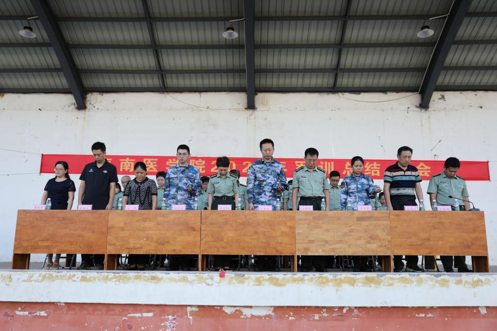 在全体参会人员向在“九一八事变”中落难的同胞们致哀后,大会在雄壮的国歌声中拉开序幕,全体起立向国旗行注目礼,全场气氛肃静而庄严。在军训成果汇报展示中,军体拳方队的表现让我们看到新时代男儿健康的体魄和自强奋斗、敢于担当的精神,赢得参会全体师生的喝彩;新生军训会操展示中,新生们依次迈着整齐一致的步伐,喊着铿锵有力的口号,做着规范标准的军事课目,无不彰显着海医学子朝气蓬勃,奋发向上的风貌,给军训教官、辅导员交上一份满意的答卷,并获得学校领导的高度好评。