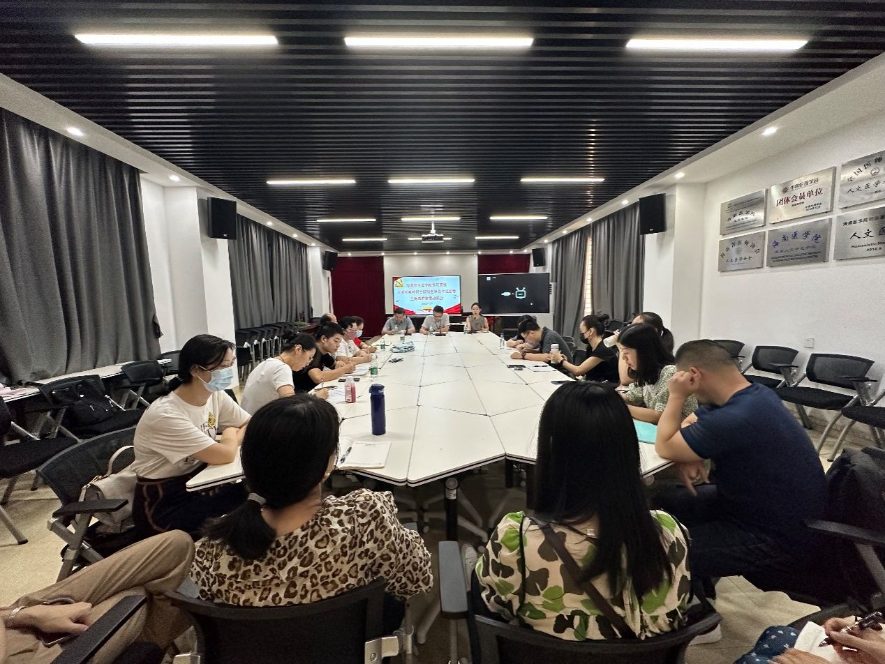 首先,邹庆华就马克思主义学院在学校主题教育中承担的主要任务进行了说明,并就完成相关工作的人员分工、时间节点和具体要求作出了安排。随后,黎同柏组织学习了《 学习贯彻习近平新时代中国特色社会主义思想主题教育实施方案》中的重点内容,并就马克思主义学院开展主题教育的工作安排提出了初步意见。最后,雷浩泽传达了校长赵建农在 学习贯彻习近平新时代中国特色社会主义思想主题教育工作会议上的讲话精神,并对马克思主义学院的主题教育提出了四个方面的要求:第一,全体教职工要提高政治站位,深刻理解开展学习贯彻习近平新时代中国特色社会主义思想主题教育的重要意义;第二,要深刻认识马克思主义学院在主题教育中的使命和责任,高标准完成学校党委安排的各项工作任务;第三,要严格把握主题教育的目标要求和主要任务,抓出学院的特色,务求取得实效;第四,强化责任意识,确保高质量高标准组织开展主题教育。