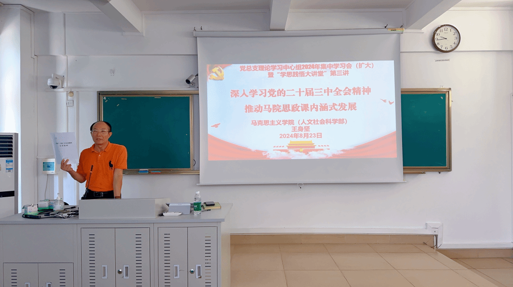 为深入贯彻落实党的二十届三中全会精神,进一步全面深化改革、推进中国式现代化新任务、新要求,深入学习贯彻落实习近平总书记关于学校思政课建设的重要指示精神,使思政课建设与党的创新理论武装同步推进,推动医学院校思政课高质量发展,2024年8月23日上午,马克思主义学院(人文社会科学部)“学思践悟大讲堂”第三场讲座在崇学楼205室开讲。学院党总支书记王身坚以《深入学习党的二十届三中全会精神 推动马院思政课内涵式发展》为题,带领学院全体教职员工深入学习党的二十届三中全会精神。学院副院长(主持行政工作)邹庆华、副书记黎同柏和学院全体教职工参加了此次讲座。