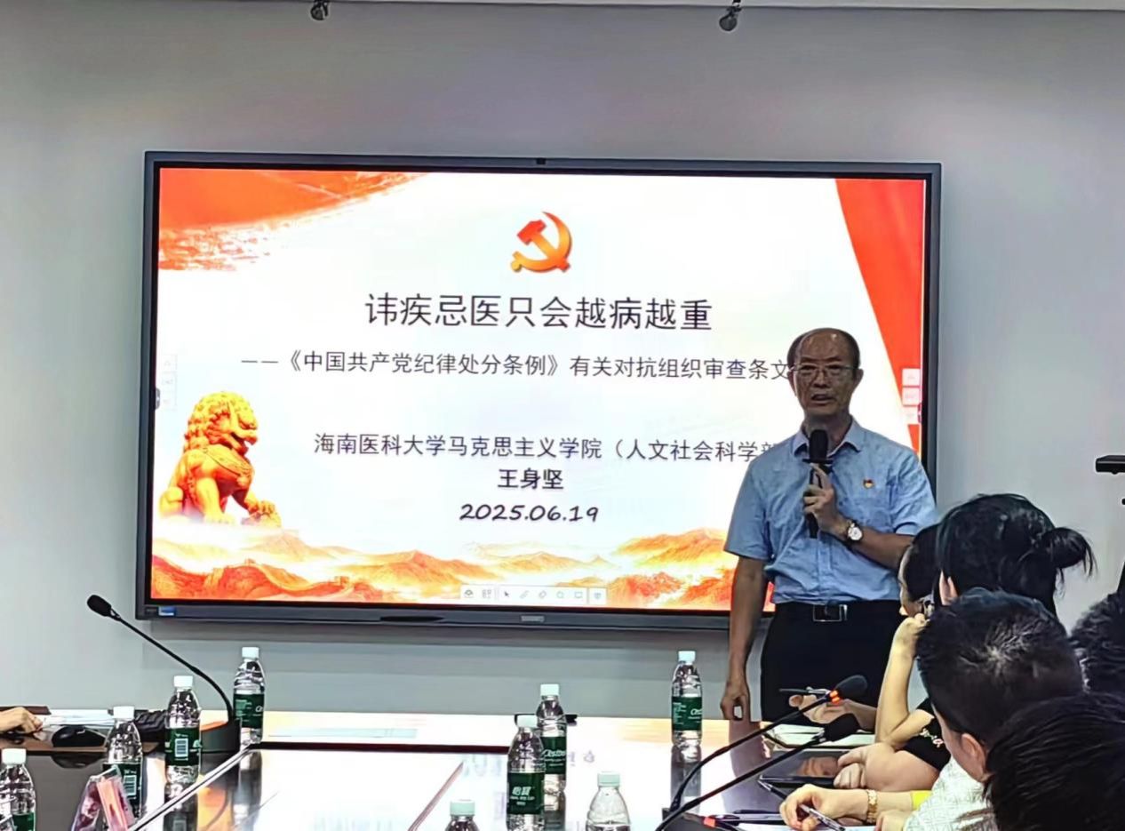 党课在学校文墀楼第二会议室举行,由马院党总支书记王身坚主讲。王书记的党课以《讳疾忌医只会越病越重——〈中国共产党纪律处分条例〉有关对抗组织审查条文解读》为题,结合自己学习《条例》的体会和工作实际,以反面典型案例为导课,紧紧围绕当前涉嫌违纪人员普遍存在对抗组织审查,以期达到逃避惩处目的的行为,通过典型案例,从“党内法规有关‘对抗组织审查’的条文”“‘对抗组织审查’的内涵要义”“对抗组织审查的五种情形”“对抗组织审查的纪律处分运用”等四个方面深入解读《条例》中有关“对抗组织审查”条文内容。