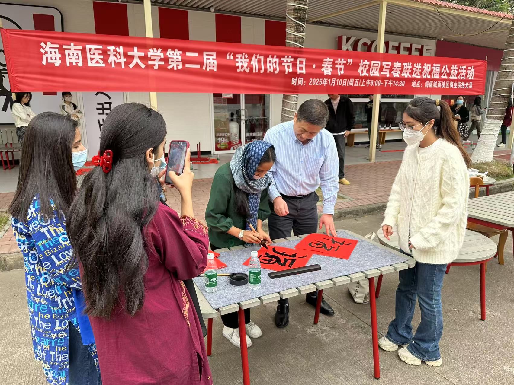 1月10日,由海南医科大学工会主办、马克思主义学院(人文社会科学部)工会承办的第二届“我们的节日·春节”校园写春联送祝福公益活动,在校园商业街——拾光里如期举办,学校工会专职干部王春东老师、马克思主义学院(人文社会科学部)全体党政班子成员、全体工会委员和近500名师生和教职工家属参加了活动。活动的成功举办,营造了浓浓的节日喜庆气氛,也点燃了很多师生对于中国传统文化,特别是书法艺术的浓厚兴趣,受到参与者的普遍欢迎。