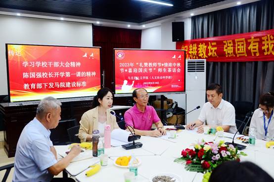 校长。在9月15日的就职仪式上,陈国强校长发表了《十年热血,愿倾天涯》的激情讲话。9月18日,在2023级新生开学典礼上,陈国强校长又以《唯有改变,方能“破天荒〞》为题,为全校师生上了一堂生动的开学第一课。陈国强校长的两篇讲话,在马克思主义学院(人文社会科学部)师生中引起强烈反响。为了抓住学院发展重大机遇,进一步激励教职工干事创业的积极性,解放思想,改革创新,推动马克思主义学院(人文社会科学部)高质量发展,学院组织举办了本次师生座谈会和迎双节茶话会。