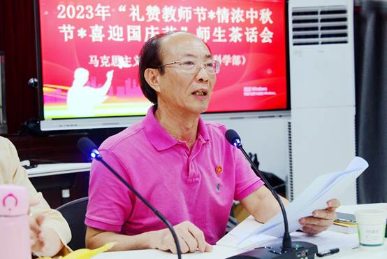 “躬耕教坛,强国有我,三全育人,马院先行”,“礼赞教师节,情浓中秋节,喜迎国庆节”的大红条幅与鲜红映衬了会场喜庆氛围。9月19日上午,马克思主义学院(人文社会科学部)在学院学术活动中心举办学习陈国强校长“就职讲话”和“开学第一课”师生座谈会暨迎中秋庆国庆茶话会。会议由学院党总支副书记黎同柏主持,学院党总支书记王身坚、副院长邹庆华和学院全体教职工参加了会议,马克思主义学院(人文社会科学部)退休教师万志全教授、郭健副教授和马克思主义学院(人文社会科学部)人文医学专业硕士研究生代表周琳等应邀参加了活动。