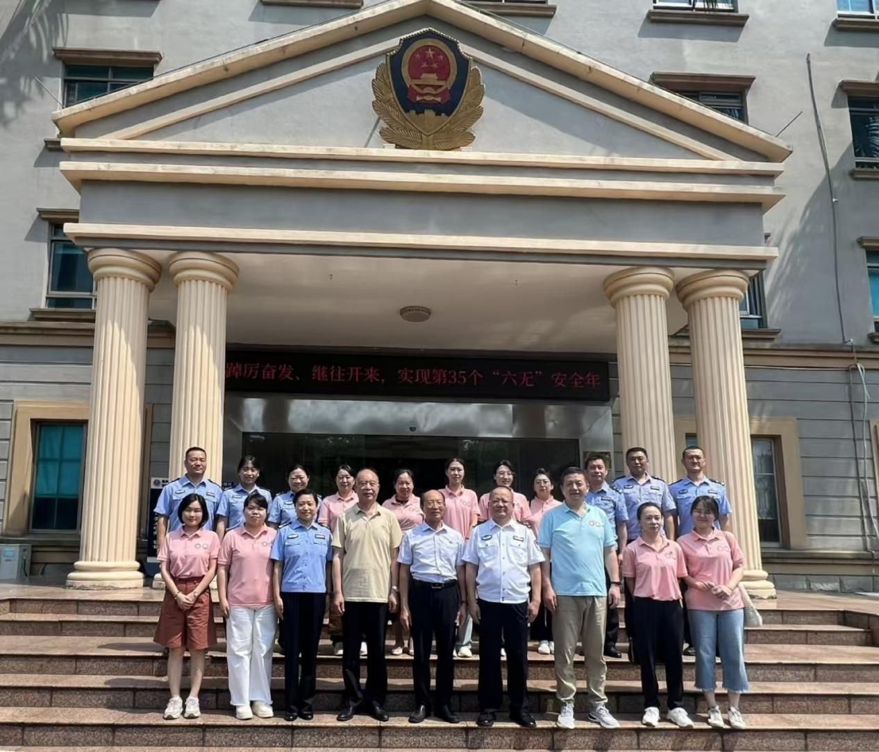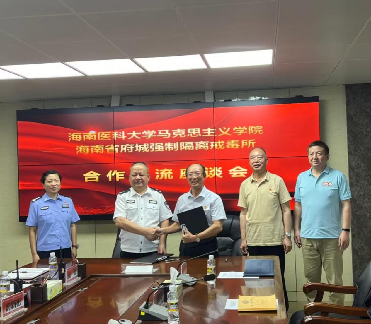 2025年5月9日上午,海南医科大学马克思主义学院(人文社会科学部)党总支书记王身坚、院长周书俊、副书记黎同柏以及党政办、教研办和各教研室负责人等一行十余人前往我院实践教学基地海南省府城强制隔离戒毒所考察交流。戒毒所党委副书记、政委金韬、副所长刘洁等领导、干警参与交流。双方就思想政治理论课实践教学建设、禁毒宣传教育、大学生志愿服务等领域的合作开展深入探讨,并签署《宣传教育和志愿服务合作协议》。
