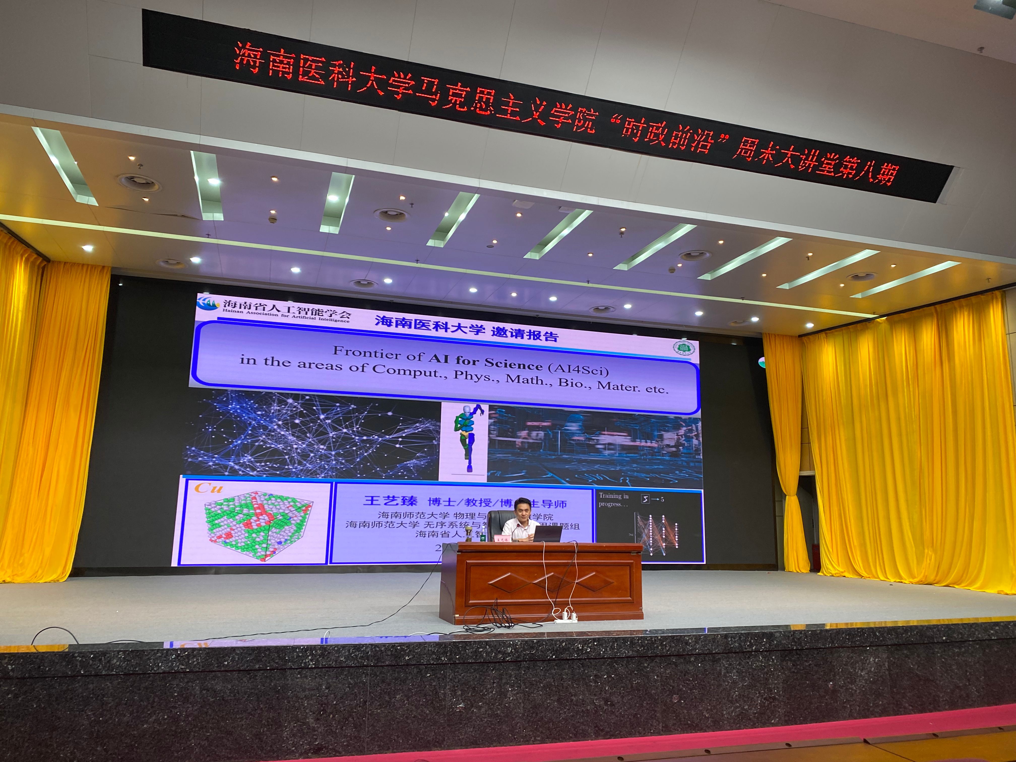 2025年5月25日晚,马克思主义学院(人文社会科学部)“时政前沿”周末大讲堂第八期在学校立德厅(国际报告厅)成功举办。为了帮助大学生了解人工智能的发展及其影响,提升大学生的人工智能素养,本期讲座特邀海南师范大学物理与电子工程学院副院长、海南省人工智能学会理事长、博士生导师王艺臻教授担任主讲嘉宾,以“Frontier of AI for Science”为题开讲。马克思主义学院(人文社会科学部)党总支副书记黎同柏主持讲座,形势与政策教研室教师徐海波、马朝林、刘欢及近600名师生共同参与。