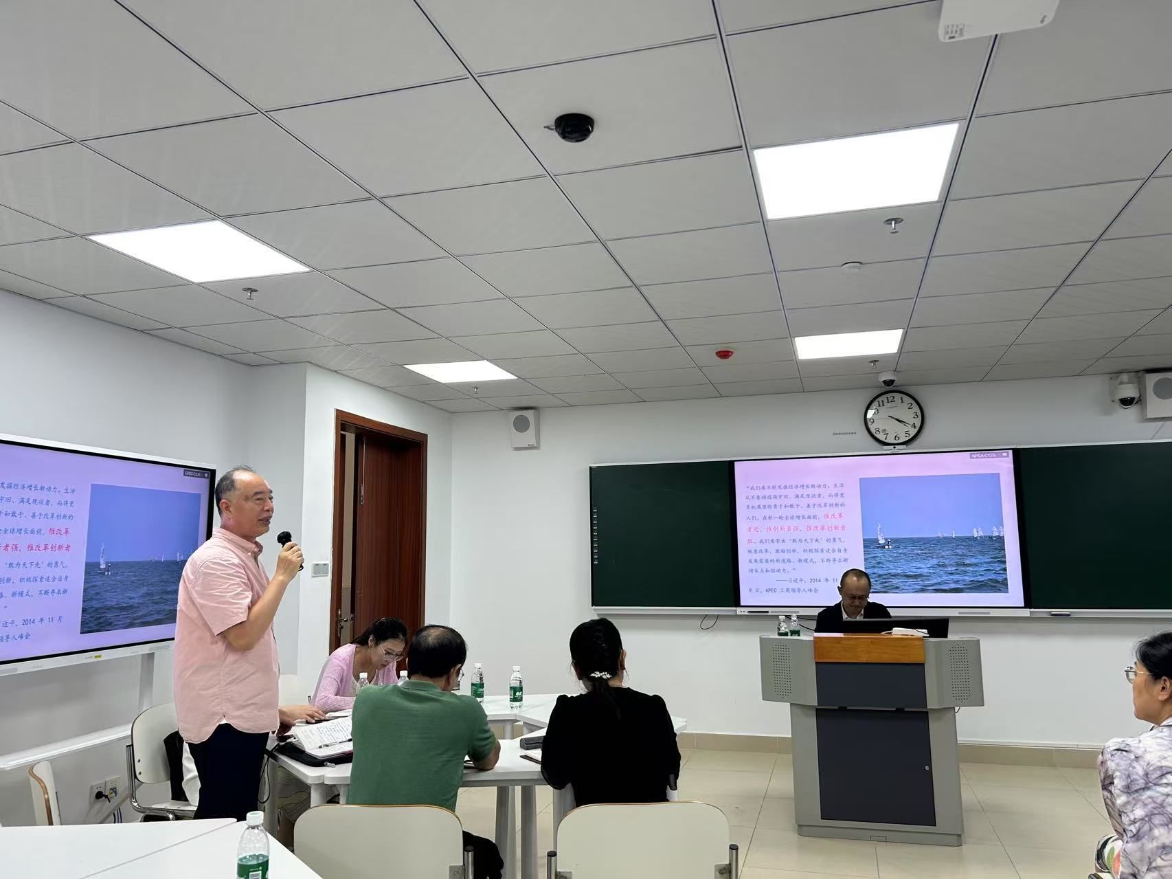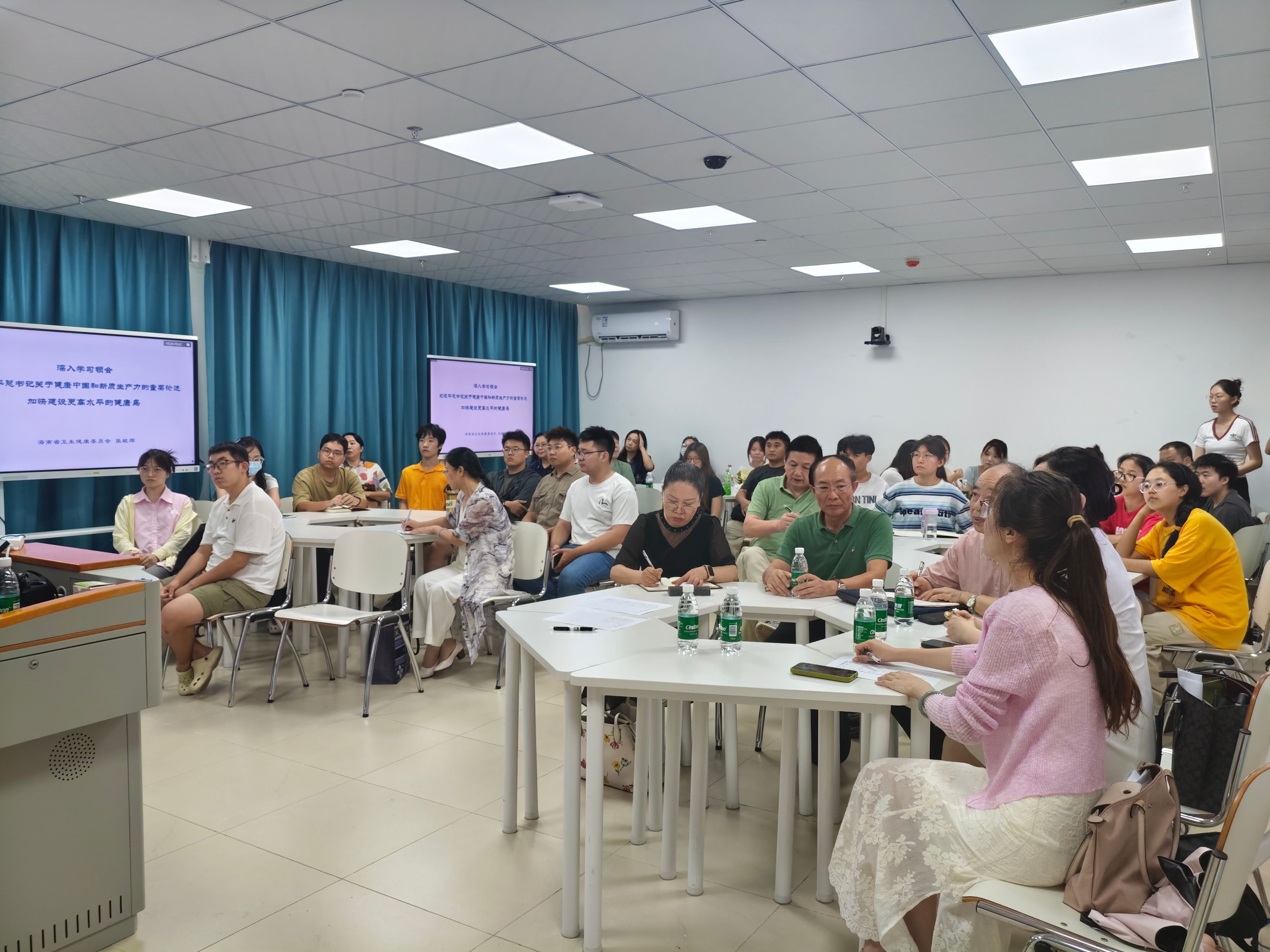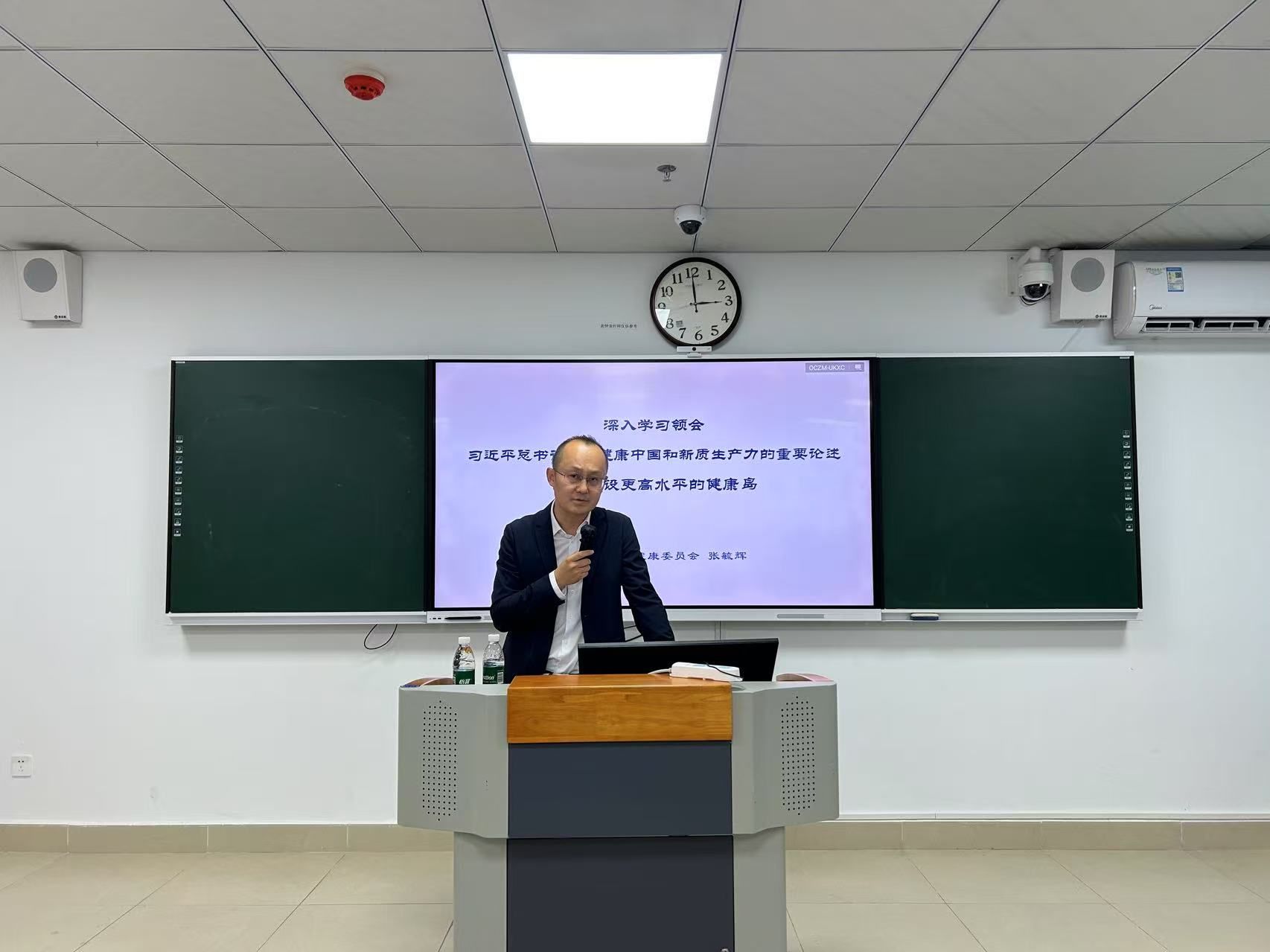 7月7日下午,海南省卫生健康委员会副主任张毓辉在海南医科大学智慧教室301室,讲授题为《深入学习领会习近平总书记关于健康中国和新质生产力的重要论述 加快建设更高水平的健康岛》的思政课。部分大学生现场聆听,马克思主义学院(人文社会科学部)党政班子成员和教师代表参加学习。