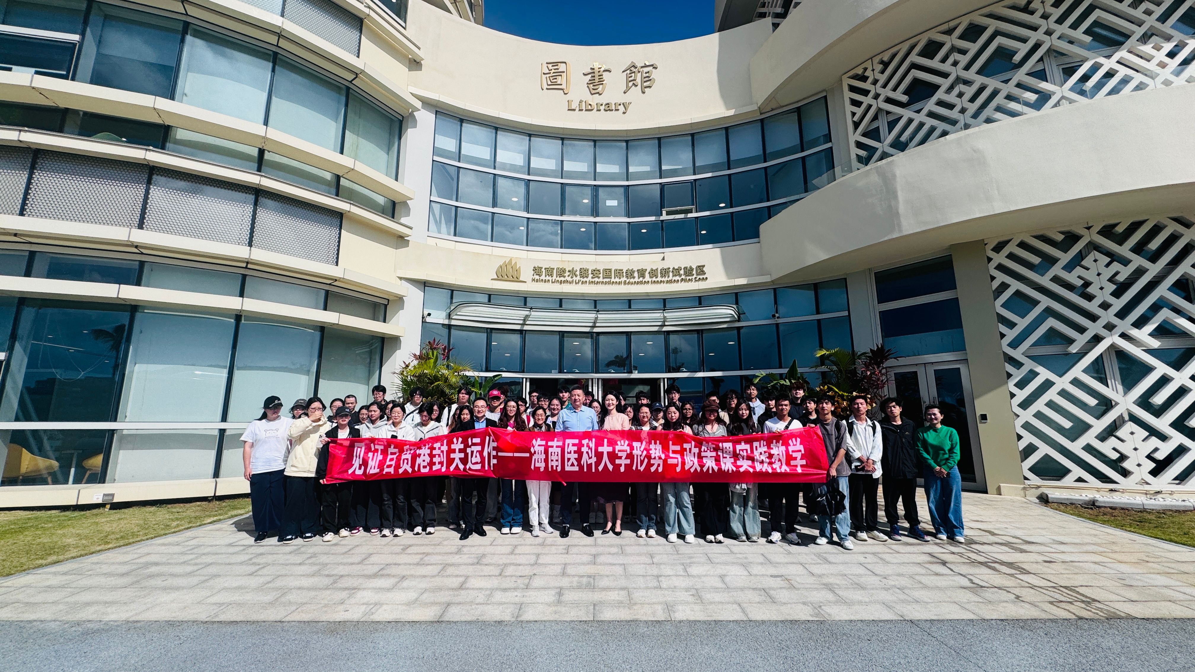在海南自贸港全岛封关运作进入最后倒计时的历史性时刻,为引导青年学子亲身感受自贸港建设脉搏,2025年12月11日,马克思主义学院黎同柏、蒋红艳、刘欢、徐海波等教师带领2025级生物技术、生物统计等专业近50名学生代表,奔赴陵水黎安国际教育创新验区和博鳌乐城国际医疗旅游先行区,成功开展了一场生动的“行走的思政课”一一“见证自贸港”主题实践教学活动。